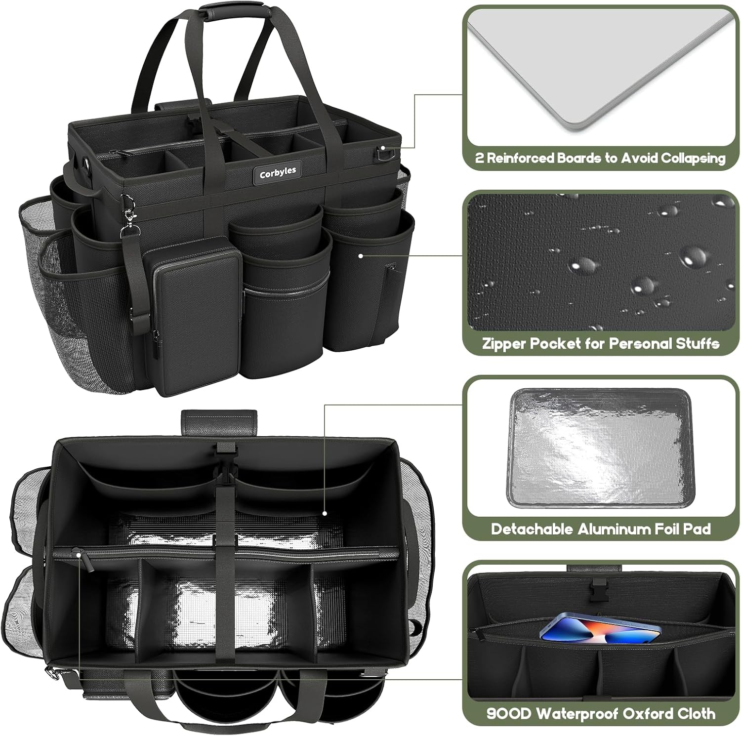 - Waterproof & Easy to Clean: Corbyles rolling cleaning caddy is made of 900D Oxford fabric with a PVC coating for waterproofing and durability. The cleaning supplies organizer has two reinforced support panels sewn to the front and back to keep the bag in shape. The bottom has a removable aluminum foil liner for easy cleaning. Safety clasp at the top prevents items from falling out when filled with cleaning supplies.