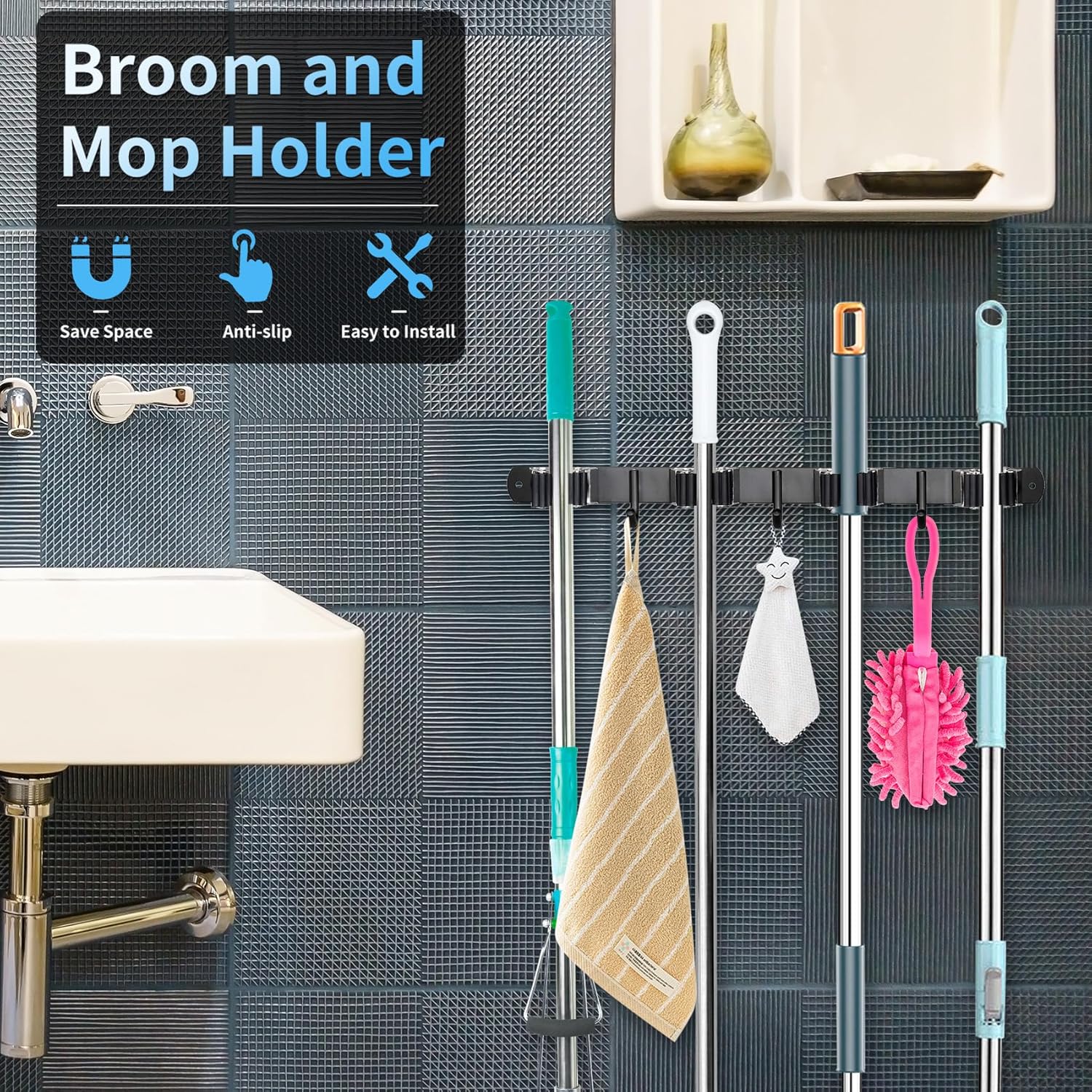 - Easy to install: The mop holder wall mounted comes with simple and clear instructions, making it easy to install with just a few basic tools. Whether you choose to use screws or adhesive, broom and mop holder the installation process is straightforward and can be completed in just a few minutes.