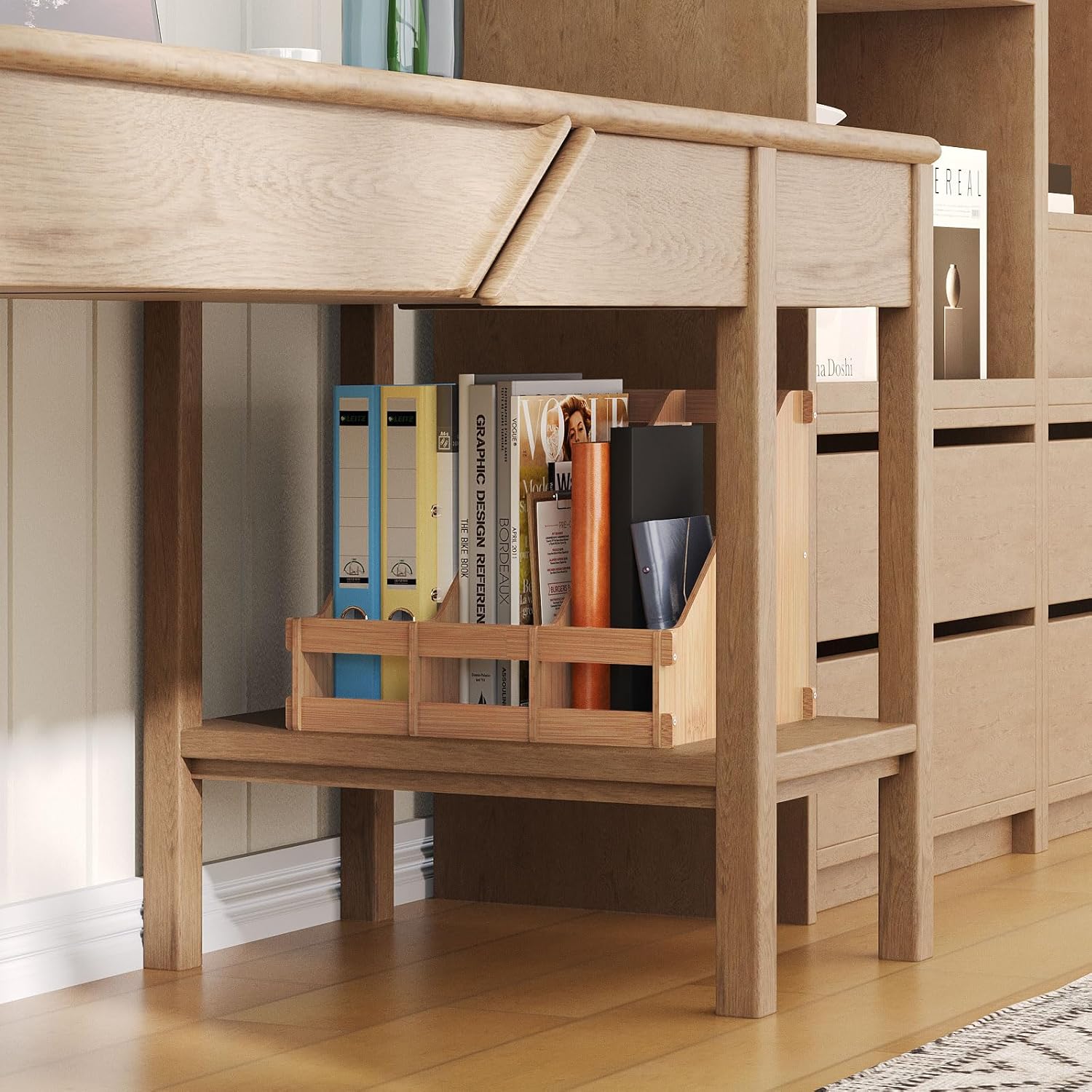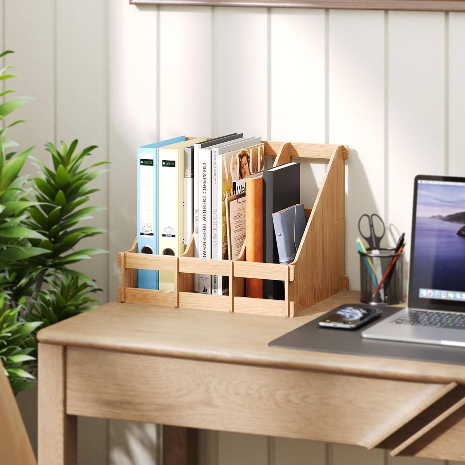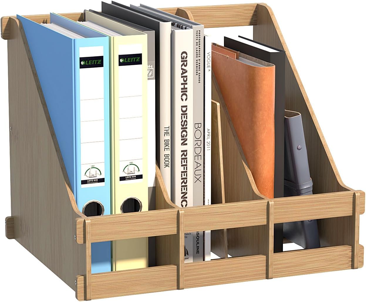 - Space Saving: Large capacity wood magazine file holder having 3 compartments for organizing everything on your desktop, saving a lot space for daily work.