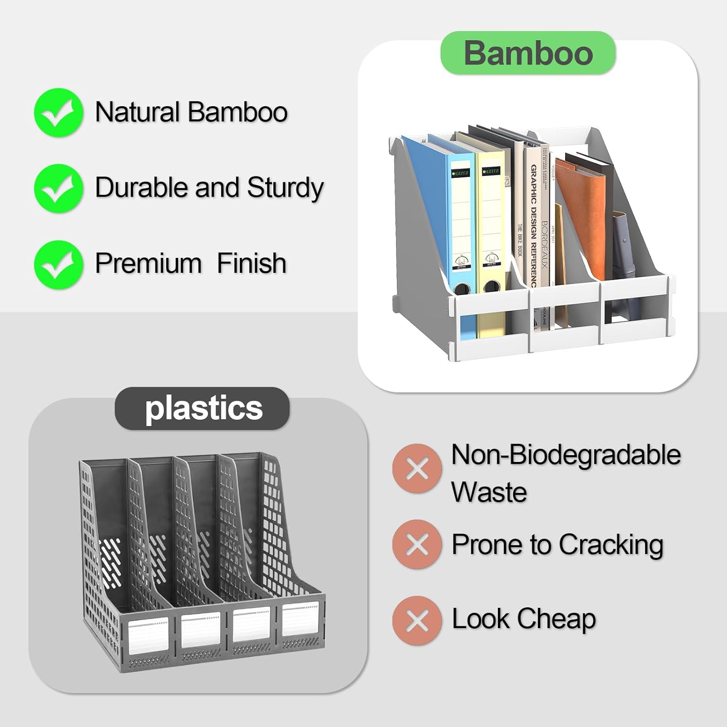 Bamboo Desktop Magazine Holder Desk File Organizer 3 Compartments Vertical File Dividers Book Holder Frames Document Cabinet Rack Storage Organizer Box for Home Office School Black (White)