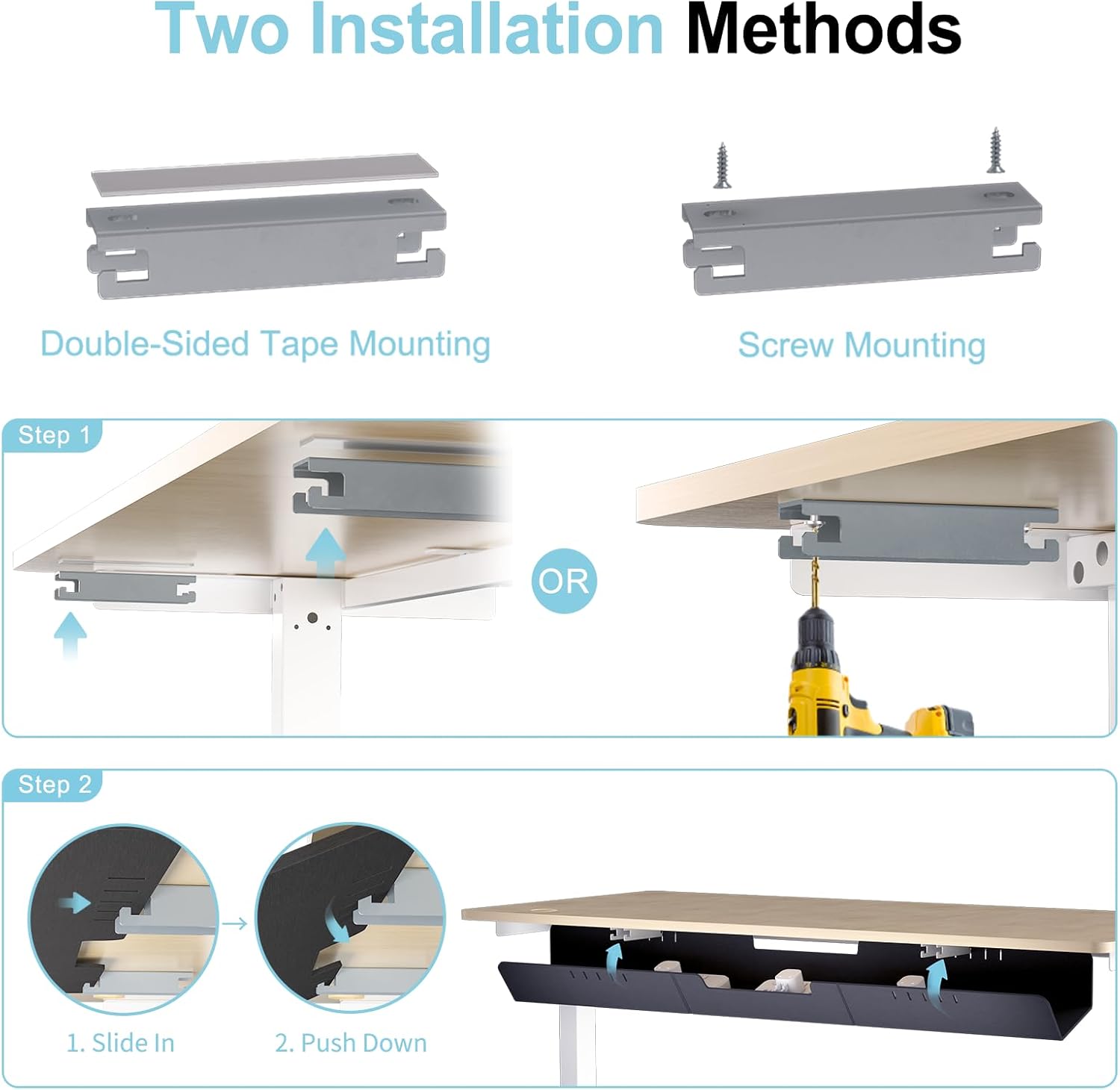 - ✅ NO-DRILL INSTALLATION – Install the under desk cable management tray easily with powerful double-sided tape — no drilling, no tools, and no damage to your wooden tabletop(Please note: May not be suitable for metal or glass surfaces). Screws are included for optional permanent mounting if needed