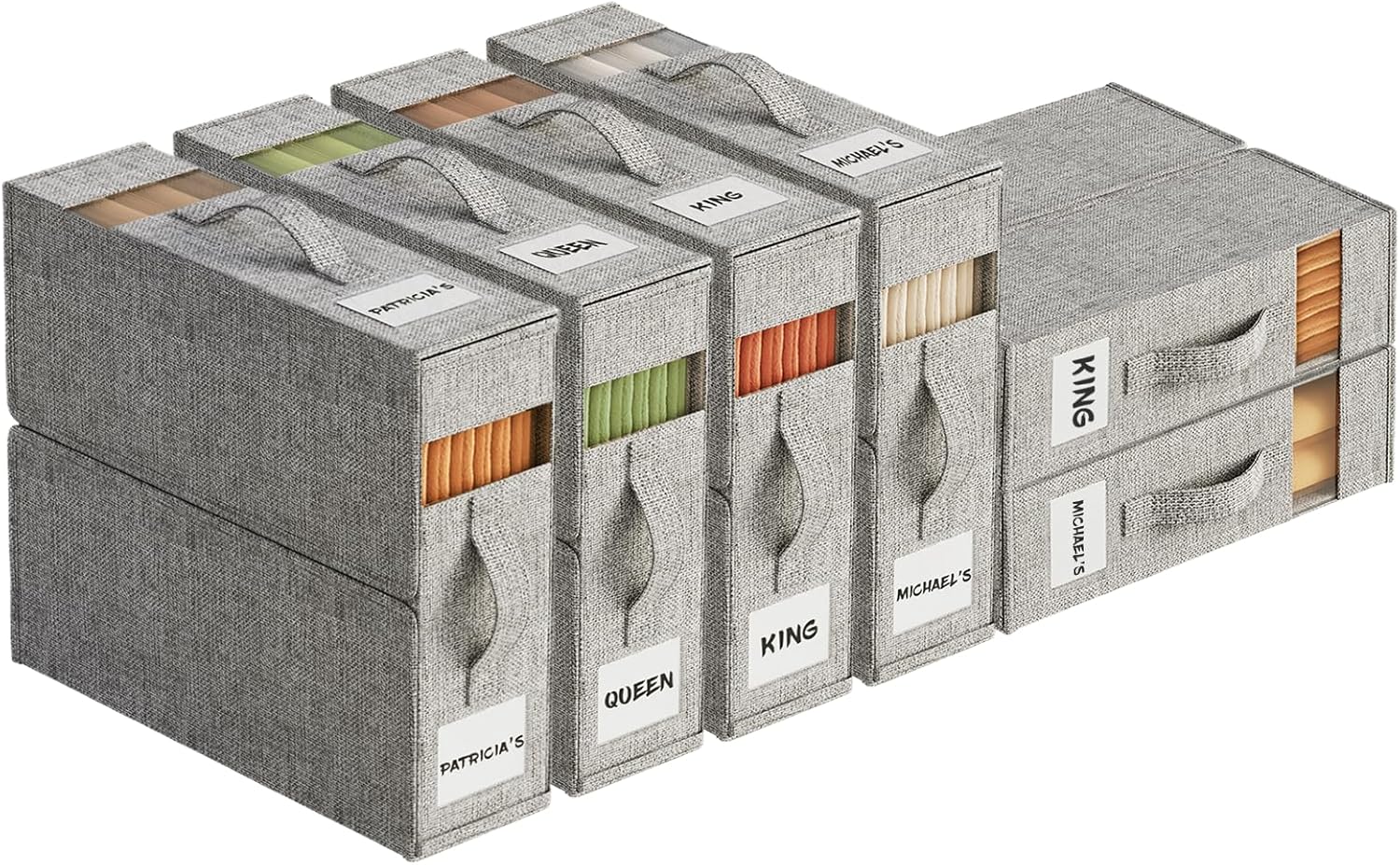 Sheet Organizers and Storage with Handles – Foldable Linen Closet Storage for King & Queen Sheet Sets – Clear Window & Removable Labels – Dustproof & Space-Saving Design, Grey,6 Pack