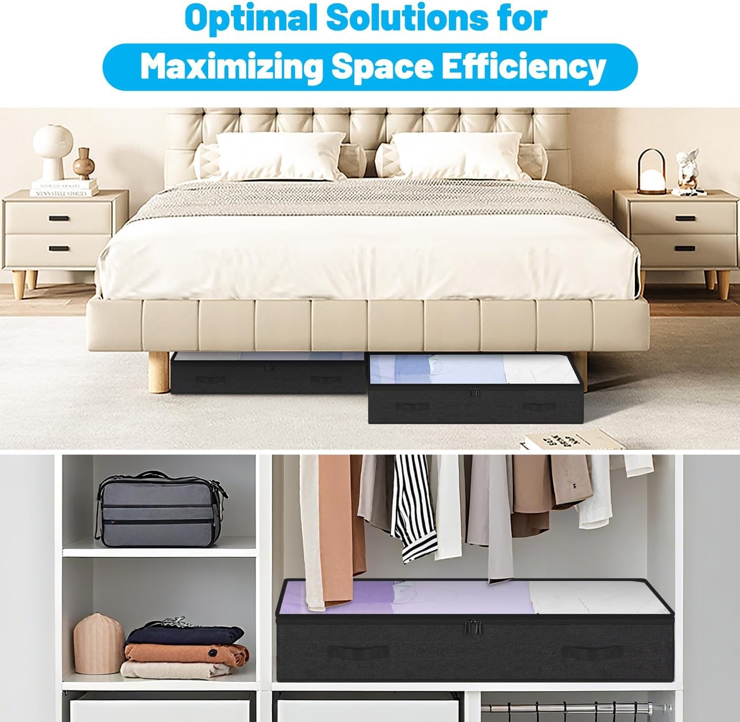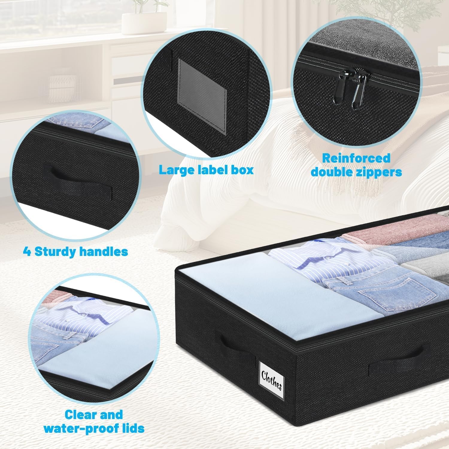 4 Pack 100L Under Bed Storage Containers, Low Profile Closet Organizers and Storage Bins for Dorm, Foldable Underbed Bag for Clothes, Blanket, Sheet, Wrapping Paper, Clear Window & Dual Zippers, Black