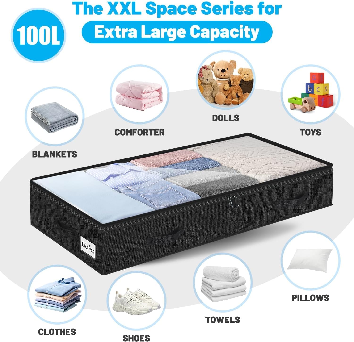 - 100L SPACIOUS CAPACITY, SIZE XX-LARGE: Each storage bin has a generous 100L capacity, measuring 40"L x 20"W x 6.7"H (low profile), perfect for fitting under beds or in closets. This 4 pack underbed storage organizer is great for organizing clothes, blankets, bedding, pillows, sheets, comforters, towels, toys, shoes, Christmas gift wraps, holiday decorations, etc. It's an essential storage organizer for school dorm rooms, bedrooms, closets, basements, under the bed / sofa, etc.