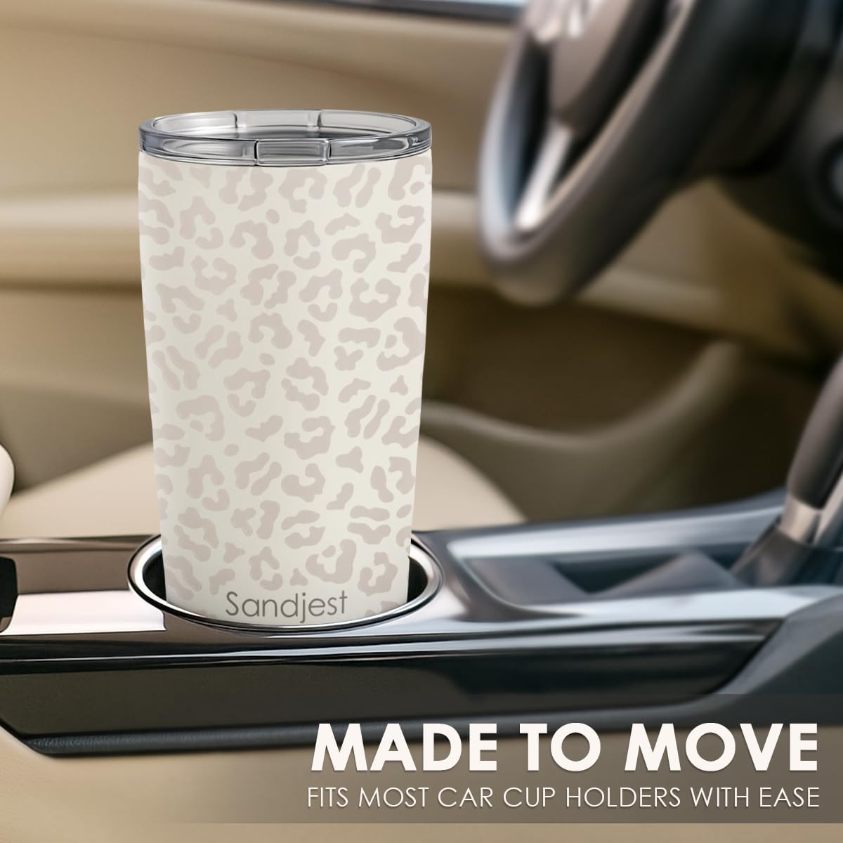 SANDJEST Leopard Print Tumbler 20oz Stainless Steel Insulated, Beige Leopard Travel Coffee Cup, Bow Gifts for Women Girls Teen, Birthday Christmas