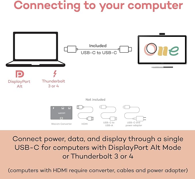 - Connectivity Technology : USB-C port with Thunderbolt 3, Thunderbolt 4, or USB Type-C supporting DisplayPort Alt mode PC on an HDMI port or a USB Type-C port without DisplayPort Alt mode requires Wacom converter (ACK45219Z) and cables (sold separately) USB-C port with Thunderbolt 3, Thunderbolt 4, or USB Type-C supporting DisplayPort Alt mode PC on an HDMI port or a USB Type-C port without DisplayPort Alt mode requires Wacom conv… See more