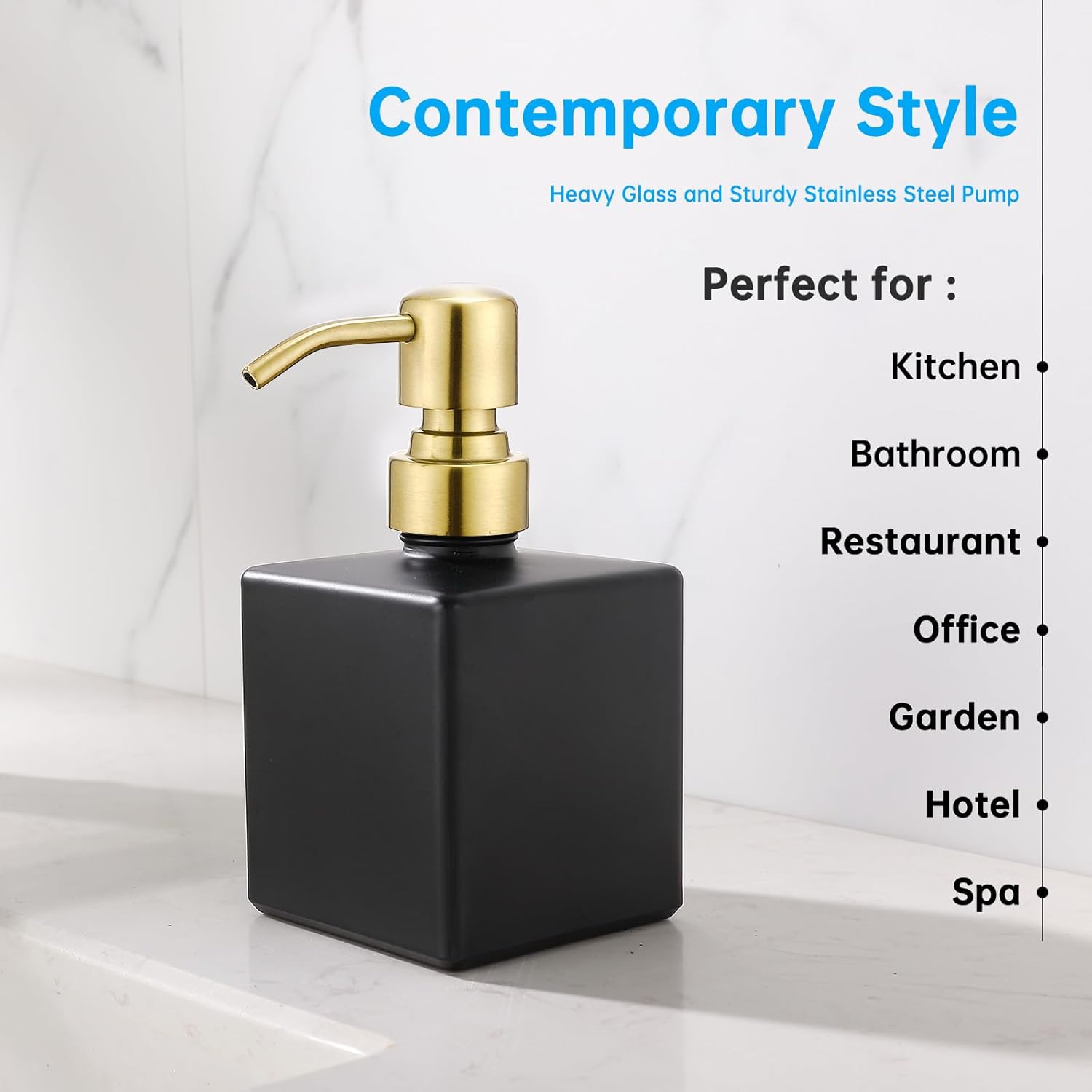 Square Bathroom Soap Dispenser Black and Gold, 8.4 oz Glass Bottles with Stainless Steel Pump Retangle Cube Liquid Soap Dispenser Hand Kitchen