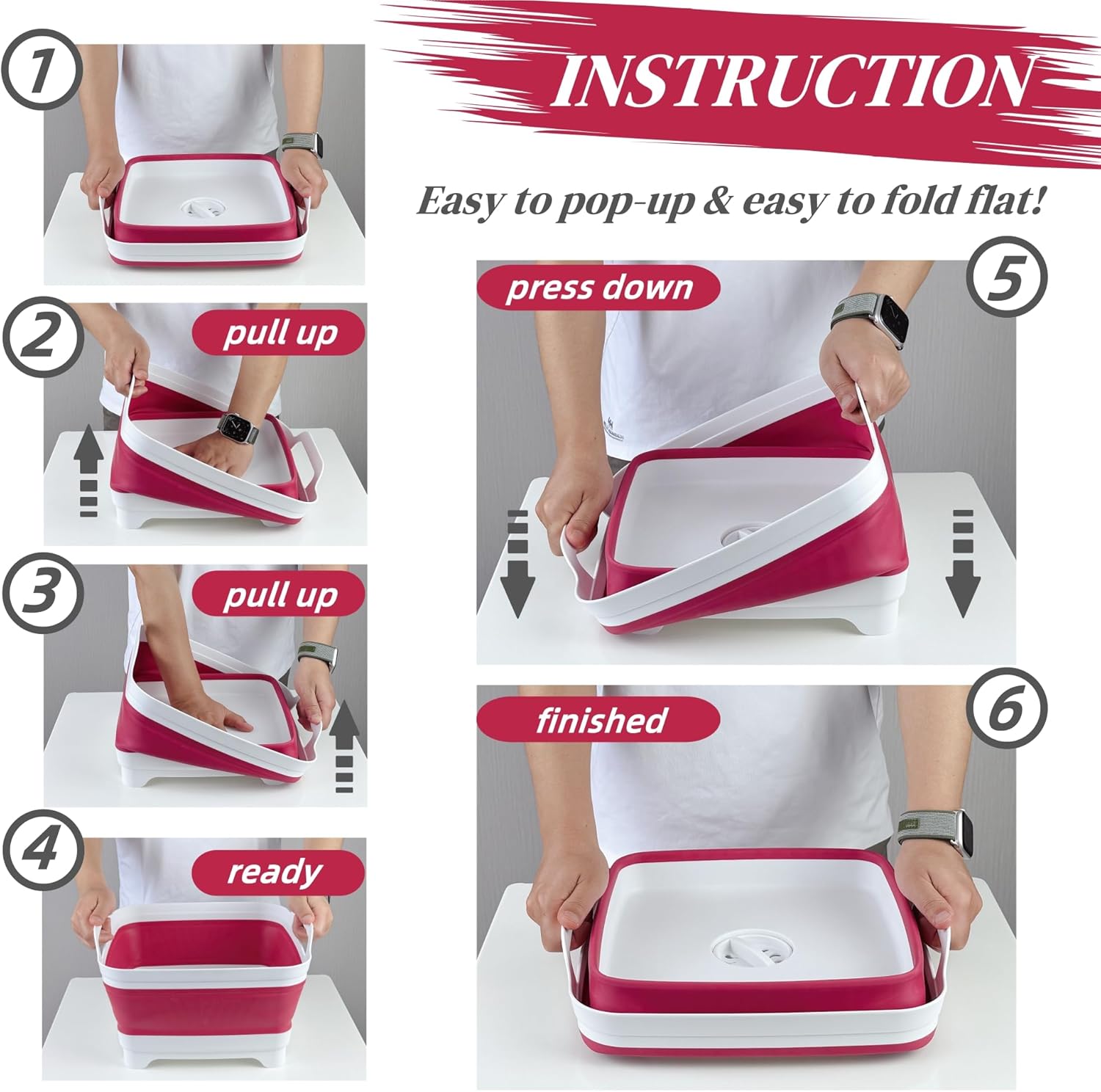 - Space-Saving & Portable: Expanding to 12 x 12 x 7.7 inches and folding to just 3 inches, this dish tub is ideal for compact sinks or other small areas. It easily folds flat for convenient storage, keeping your space tidy when not in use