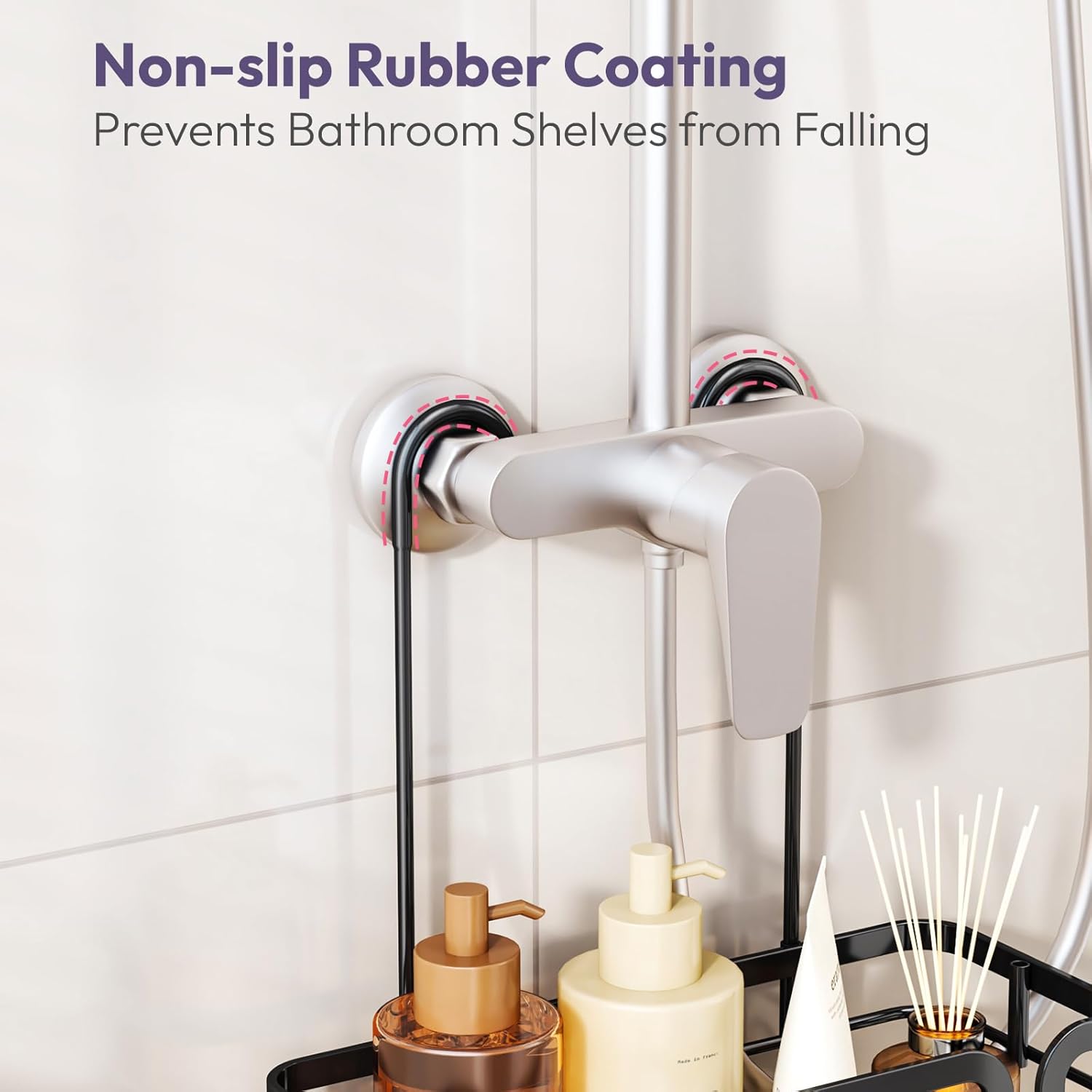 - [No Slipping or Wobbling] shower racks for inside shower is equipped with anti-slip brackets and suction cups to stay firmly in place. Strong shower storage hanging is no more slipping or tipping over like cheap plastic racks. Safe for families with kids and seniors