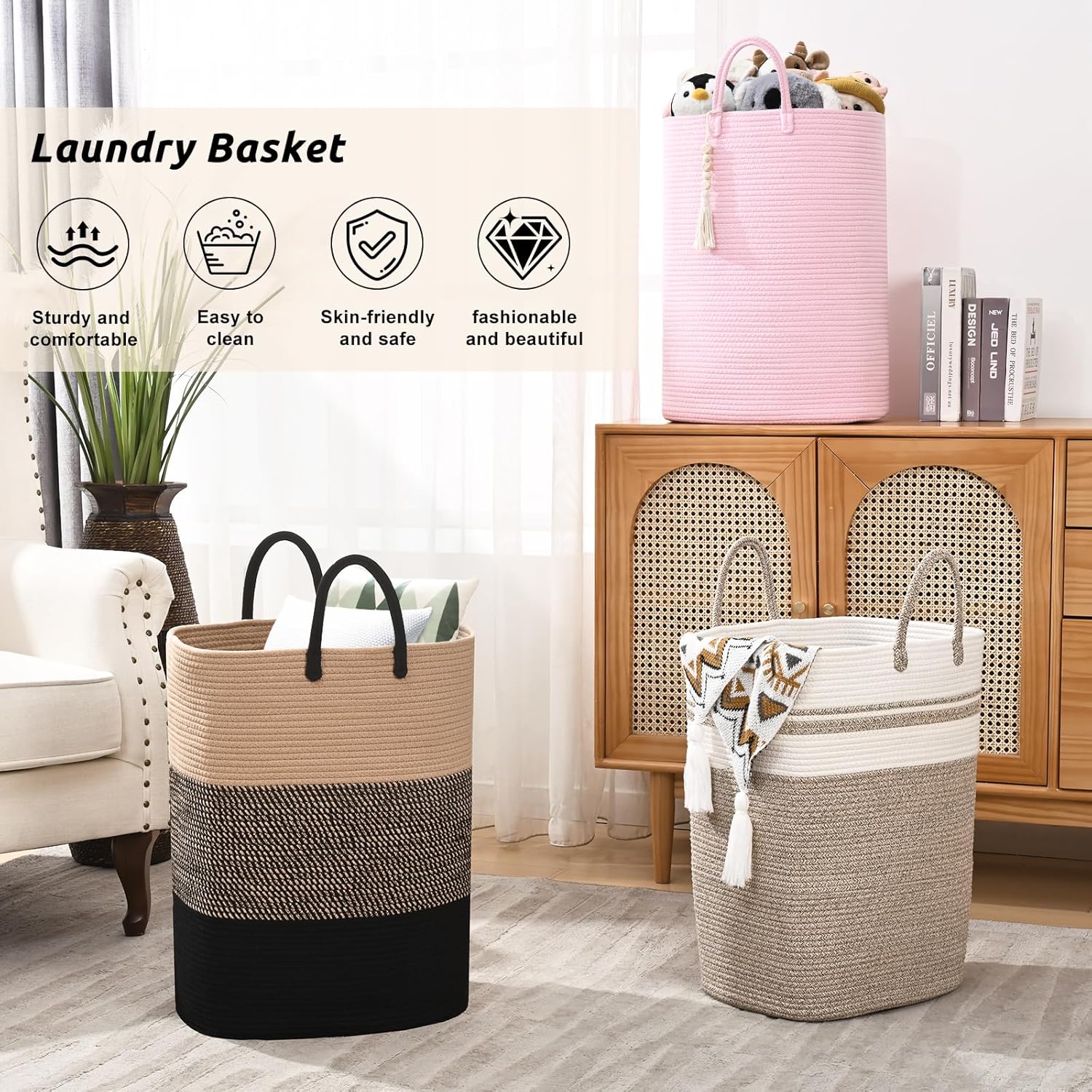 - š[DURABLE, BREATHABLE & SKIN - FRIENDLY COTTON]: Made of sturdy and odor-free rope cotton, woven laundry basket has a solid addition to any space. Tall laundry basket quite sturdy and spacious, capable of holding a good amount without losing its shape, which adds to its practicality.