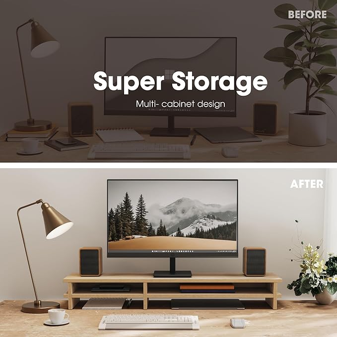 - 【2-Tier Monitor Riser】Spanning 39.4 inches, this dual monitor stand offers generous storage space for keyboards, mice or notebooks below, helping you free up desktop clutte. The left and right compartments are reversible to match your preferred layout, keeping essentials within reach yet neatly organized.