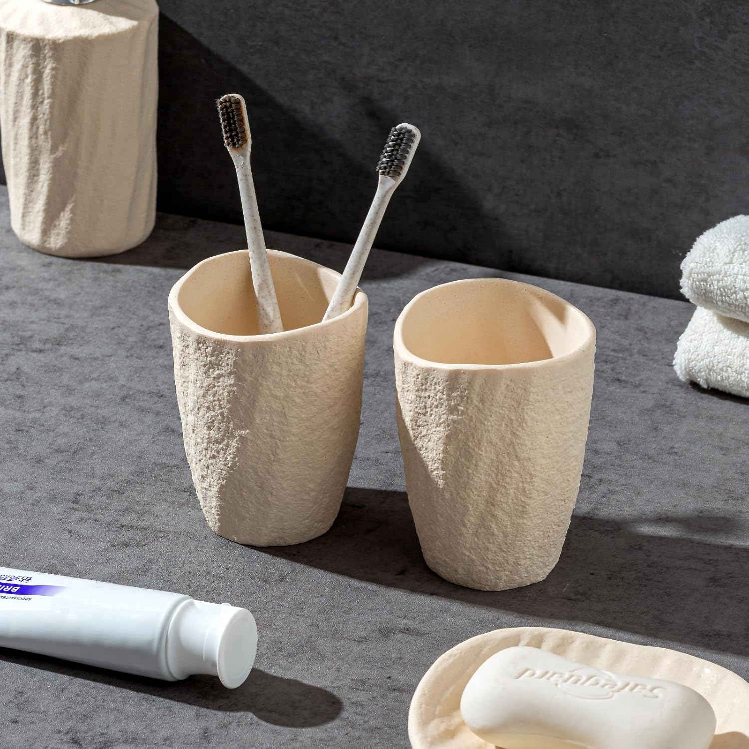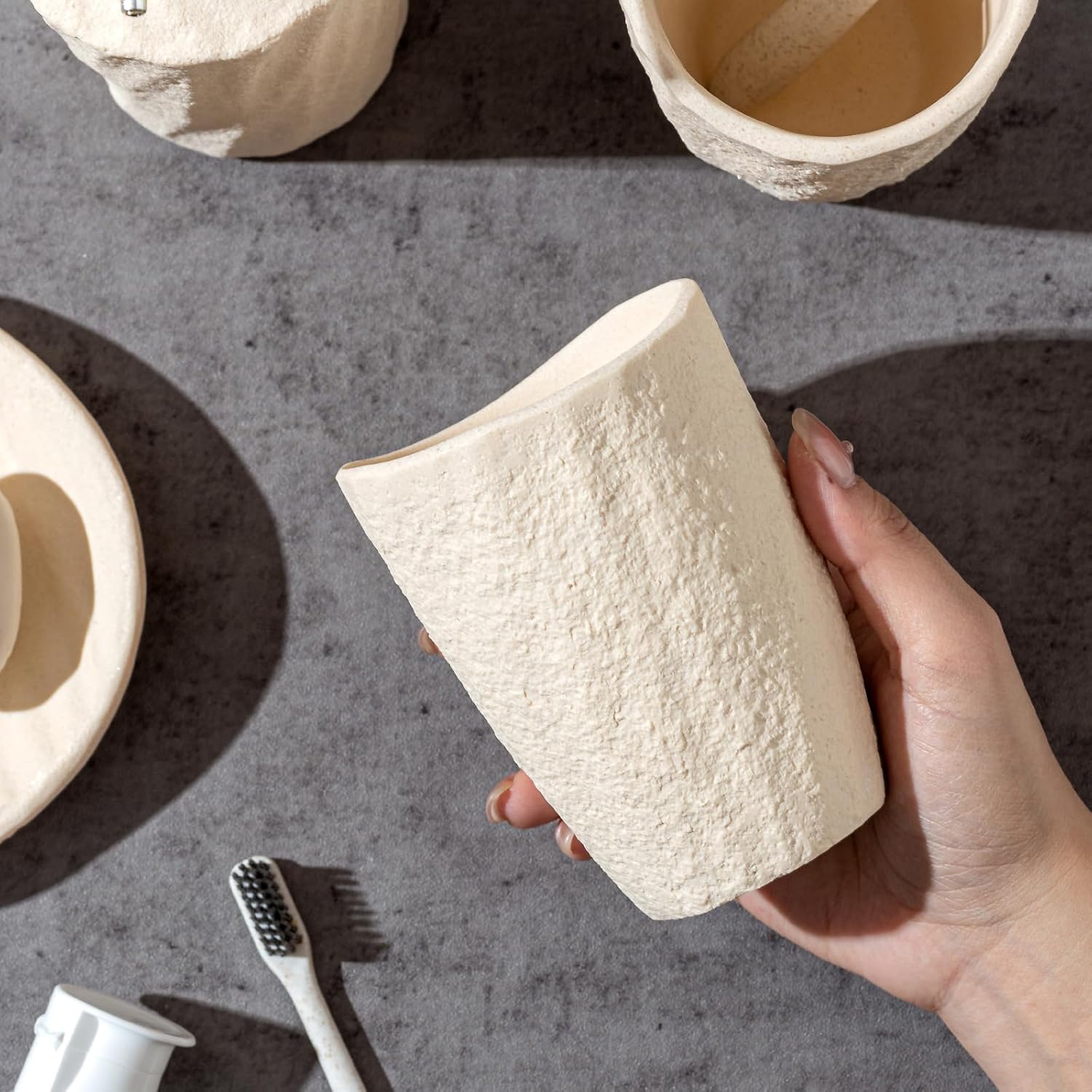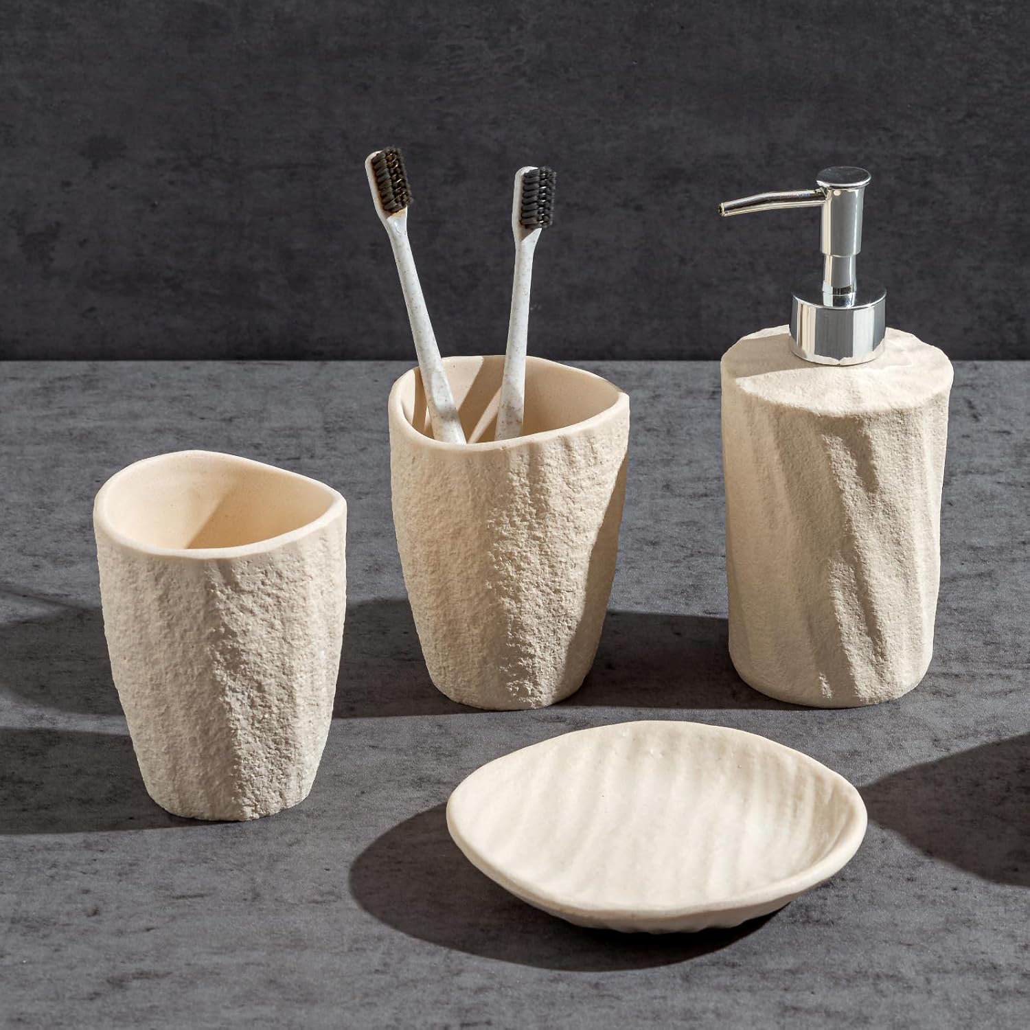 - Versatile & Functional - Stone look bathroom accessories fits in large or smaller bathrooms. Use all the pieces together in master or family bathrooms or use pieces separately for half and smaller guest bathrooms. Can be placed in the kitchen, laundry room or next to any sink. Organize and enhance your bathroom quickly and effortlessly with this bathroom set and perfect to free space on your vanity top, countertop, or makeup table.