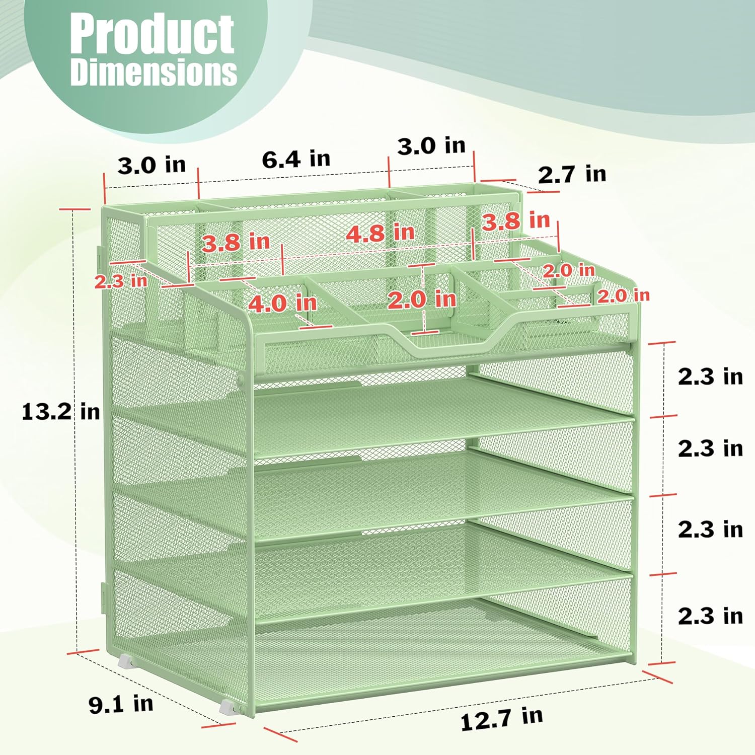 Docnest 5 Tier Mesh Desk Organizer for Paper Office Supplies – Multi-Functional Letter Tray with 5 Adjustable Compartments, 3 Pen Holders, Desktop Storage for Files, Mail, Stationery – Green