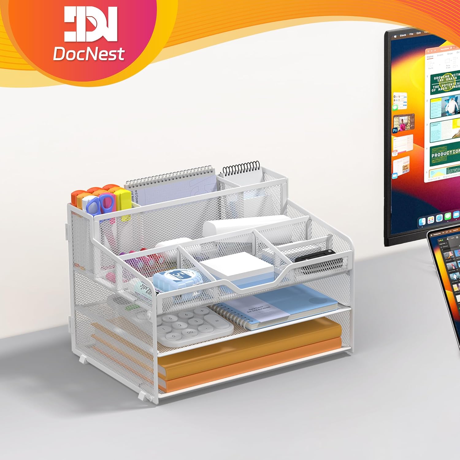 Docnest 3 Tier Mesh Desk Organizer for Paper Office Supplies – Multi-Functional Letter Tray with 5 Adjustable Compartments, 3 Pen Holders, Desktop Storage for Files, Mail, Stationery – White
