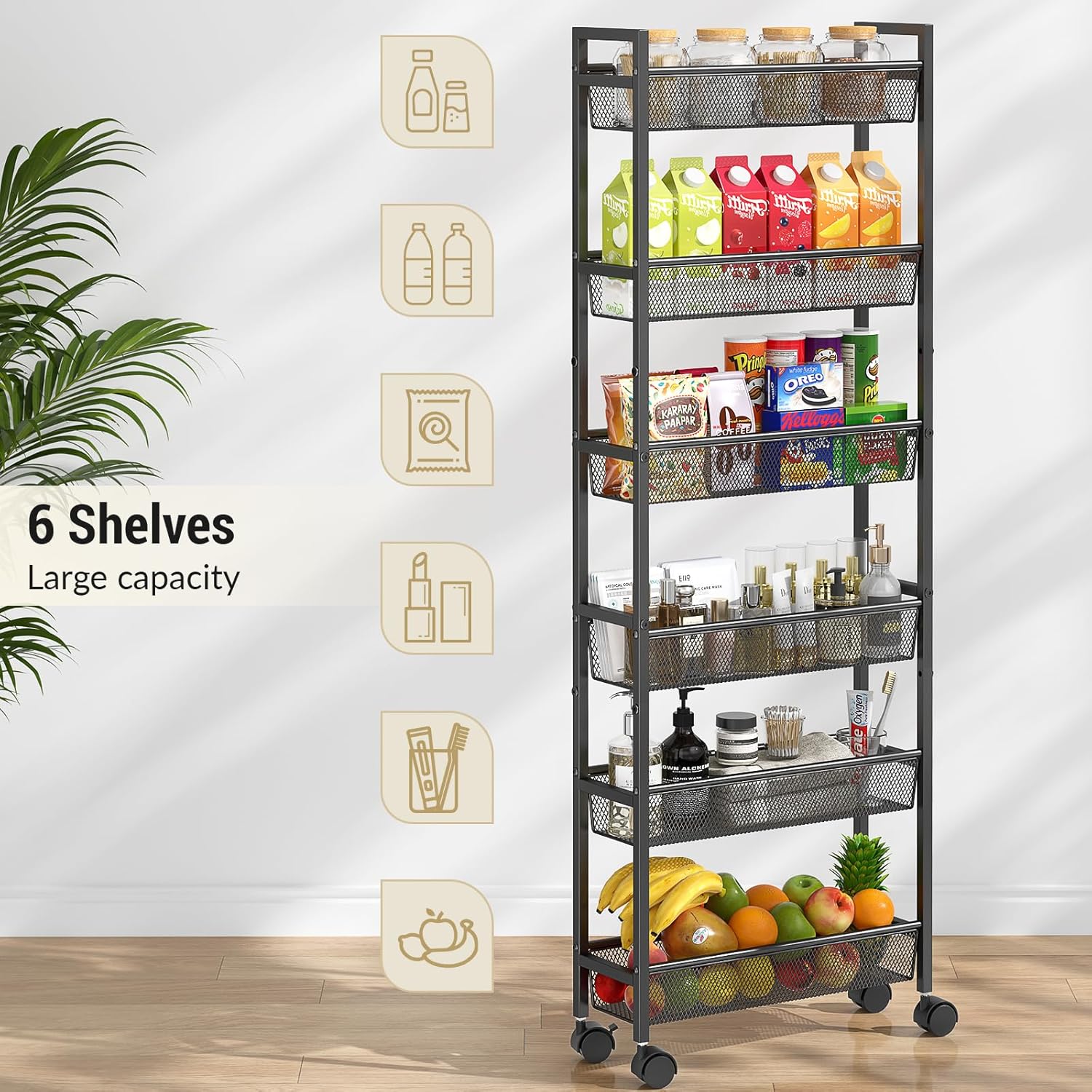 - 【6-Tier Storage】This slim storage rack is perfect for various places such as kitchen, bathroom, laundry room, living room and so on. You can use it to place spice bottles, toiletries, bath towels, books and other miscellaneous items to keep the room neat and organized, ensuring maximum storage efficiency in a small space.