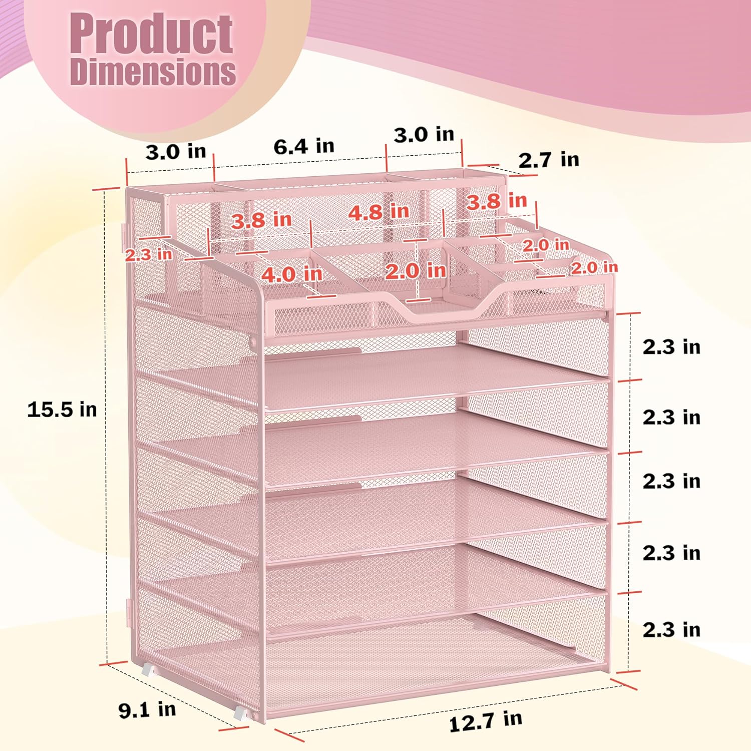 Docnest 6 Tier Mesh Desk Organizer for Paper Office Supplies – Multi-Functional Letter Tray with 5 Adjustable Compartments, 3 Pen Holders, Desktop Storage for Files, Mail, Stationery – Pink
