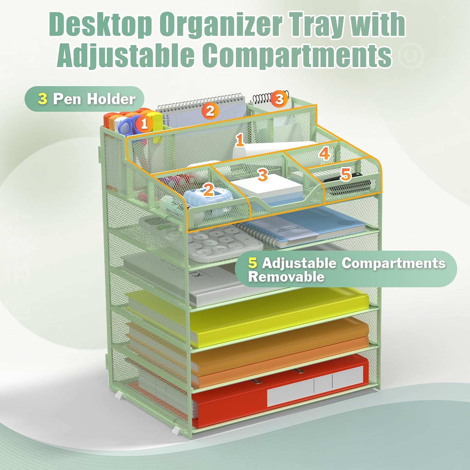 Docnest 6 Tier Mesh Desk Organizer for Paper Office Supplies – Multi-Functional Letter Tray with 5 Adjustable Compartments, 3 Pen Holders, Desktop Storage for Files, Mail, Stationery – Green