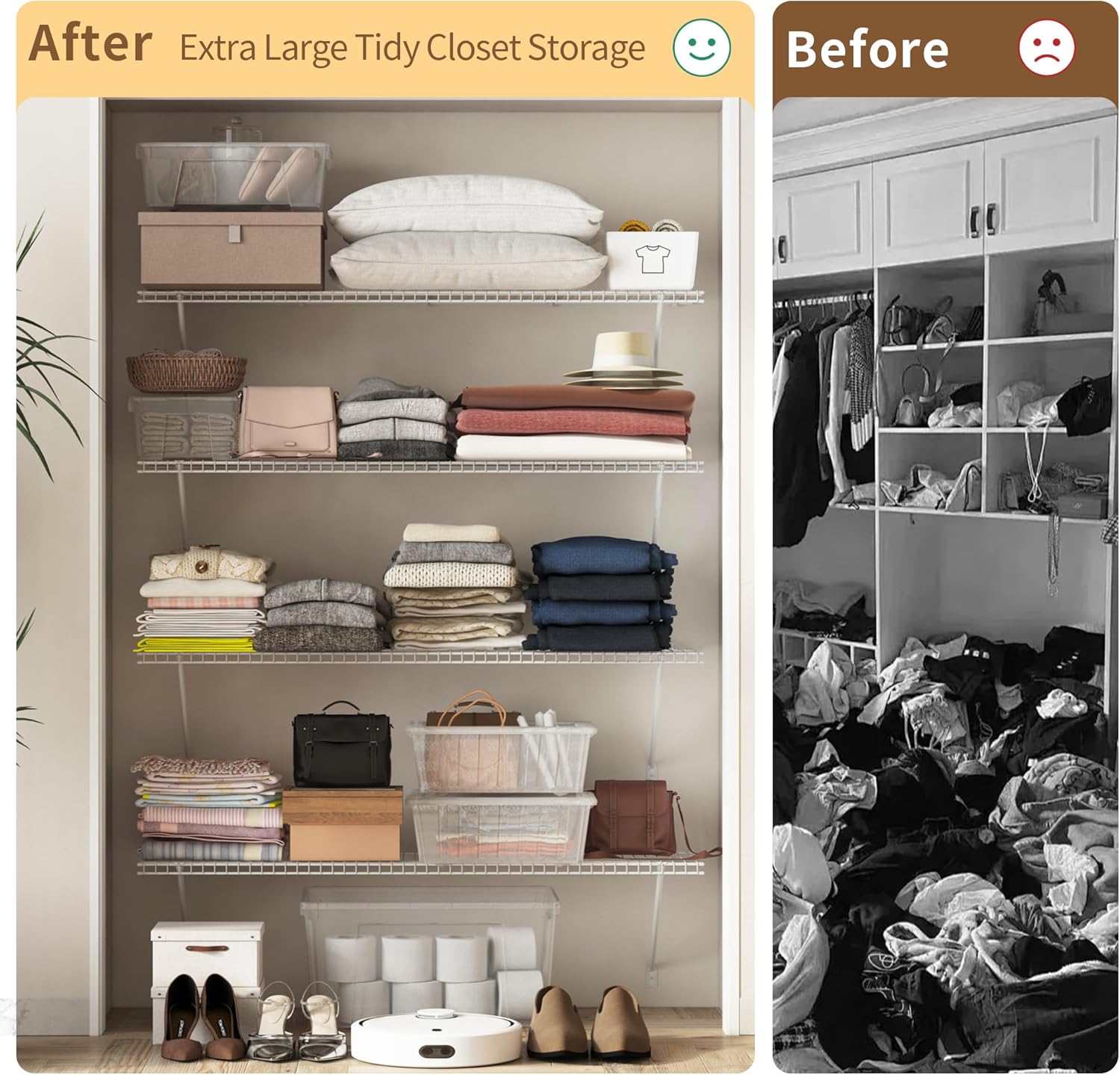 - Space-Saving & Easy Installation: Maximize your living space with the wire closet shelf. This flexible system allows for easy installation and can be mounted on walls or used as a freestanding rack. Its space-saving design helps to organize your home efficiently, making hanging closet shelves perfect for small apartments or homes with limited storage