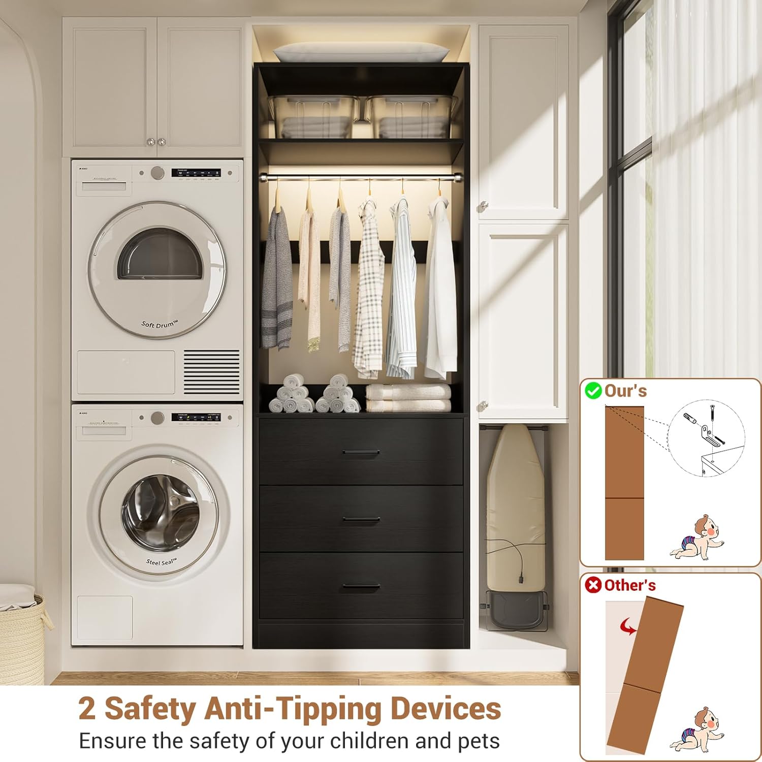 - Heavy Duty 96” Walk-in Closet - Closet systems are made of high-quality MDF boards with laminated surfaces to ensure durability. Weight capacity is up to 2000+ lbs. This is a huge upgrade from other older wire closet organizer systems. 96 inch closet system with drawers also comes with 8 anti-tip hardware to further enhance the sturdiness of the unit. Protect your kids and pets without worrying about the closet systems tipping over.
