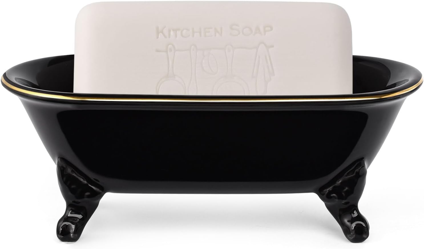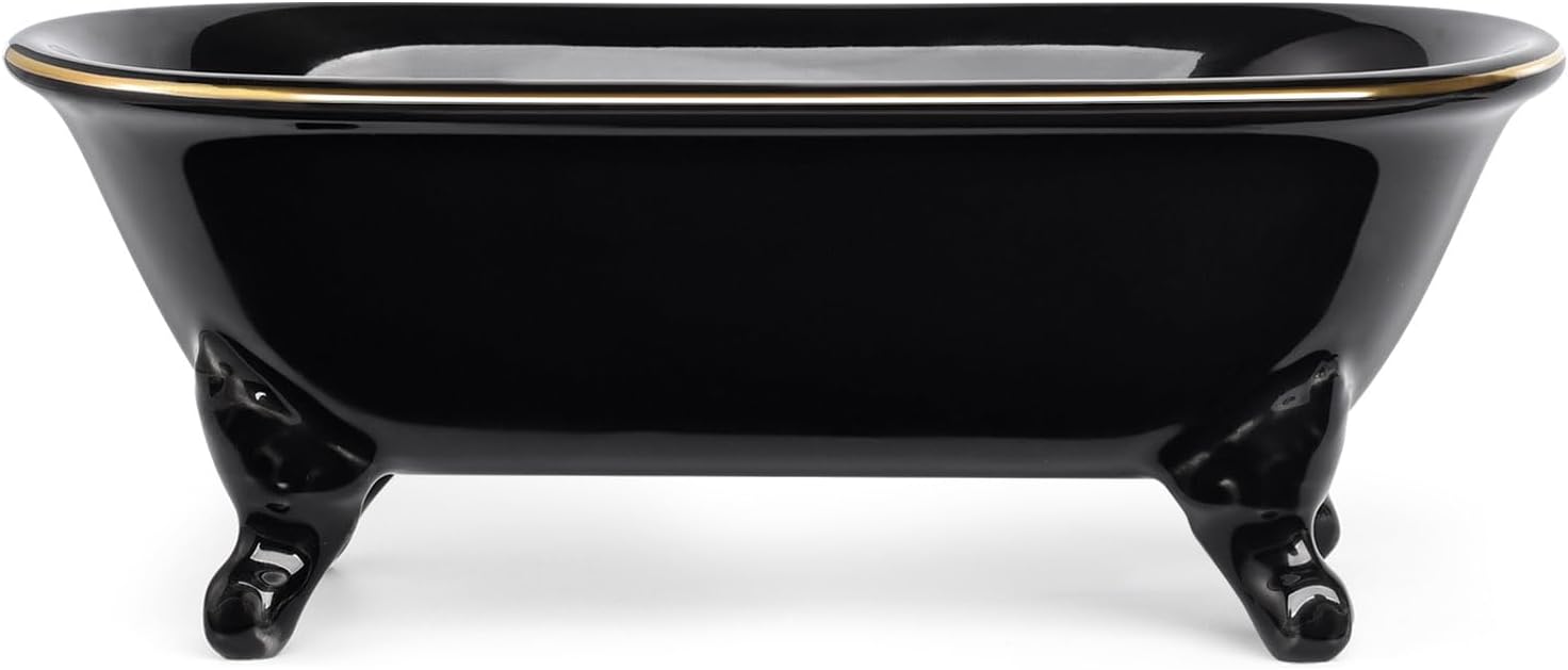 6.5" Ceramic Mini Decorative Clawfoot Bathtub Bar Soap Dish, Kitchen Sponge Holder and Shower Tray for Bathroom, 1 Pack (Black Gold Rim)