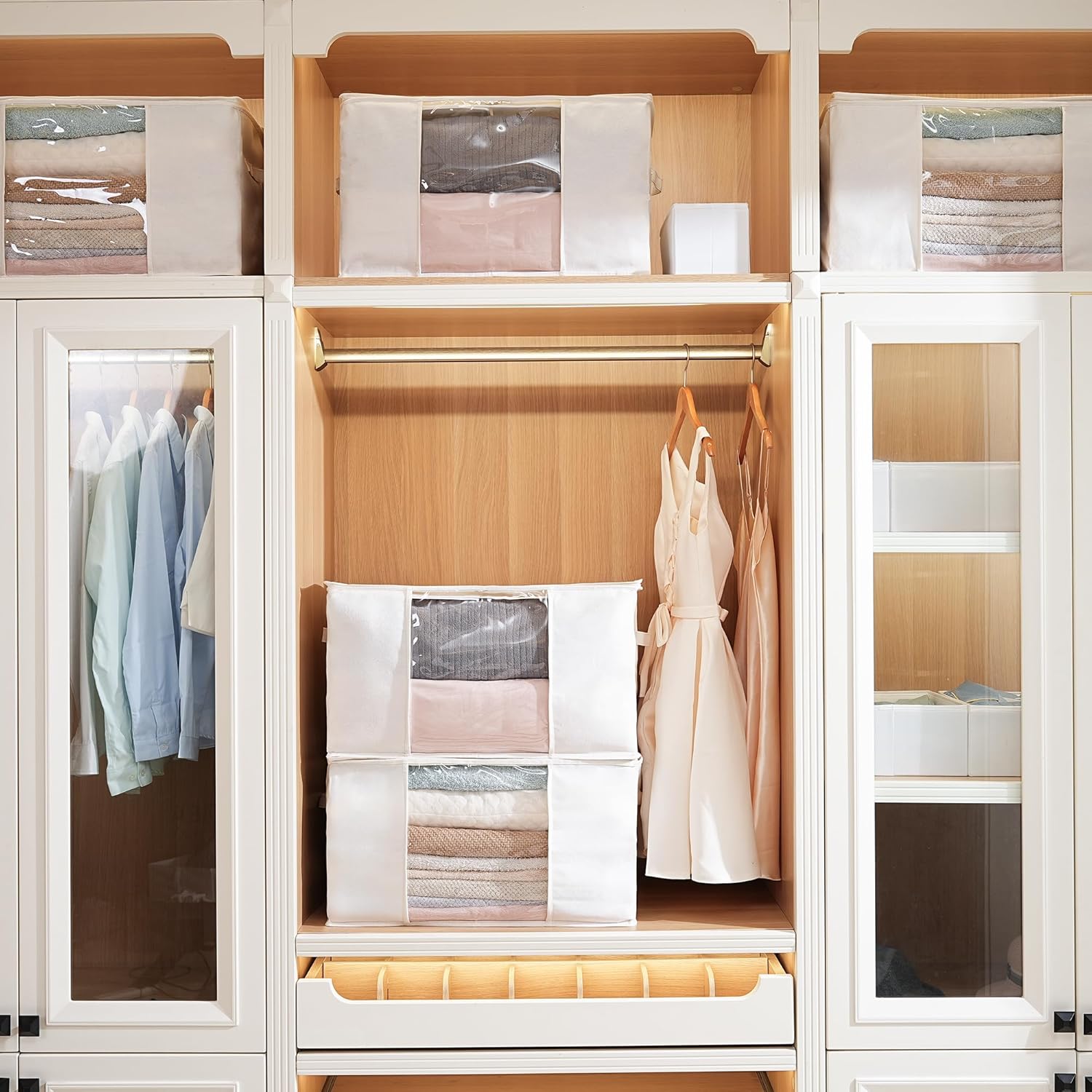 TYEERS Large Storage Bags with Zipper and Clear Window, Cotton Blended Fabric Storage Containers for Seasonal Clothes and Bedding, 23.6x15.7x13.8 Inches, 8-Pack, Beige