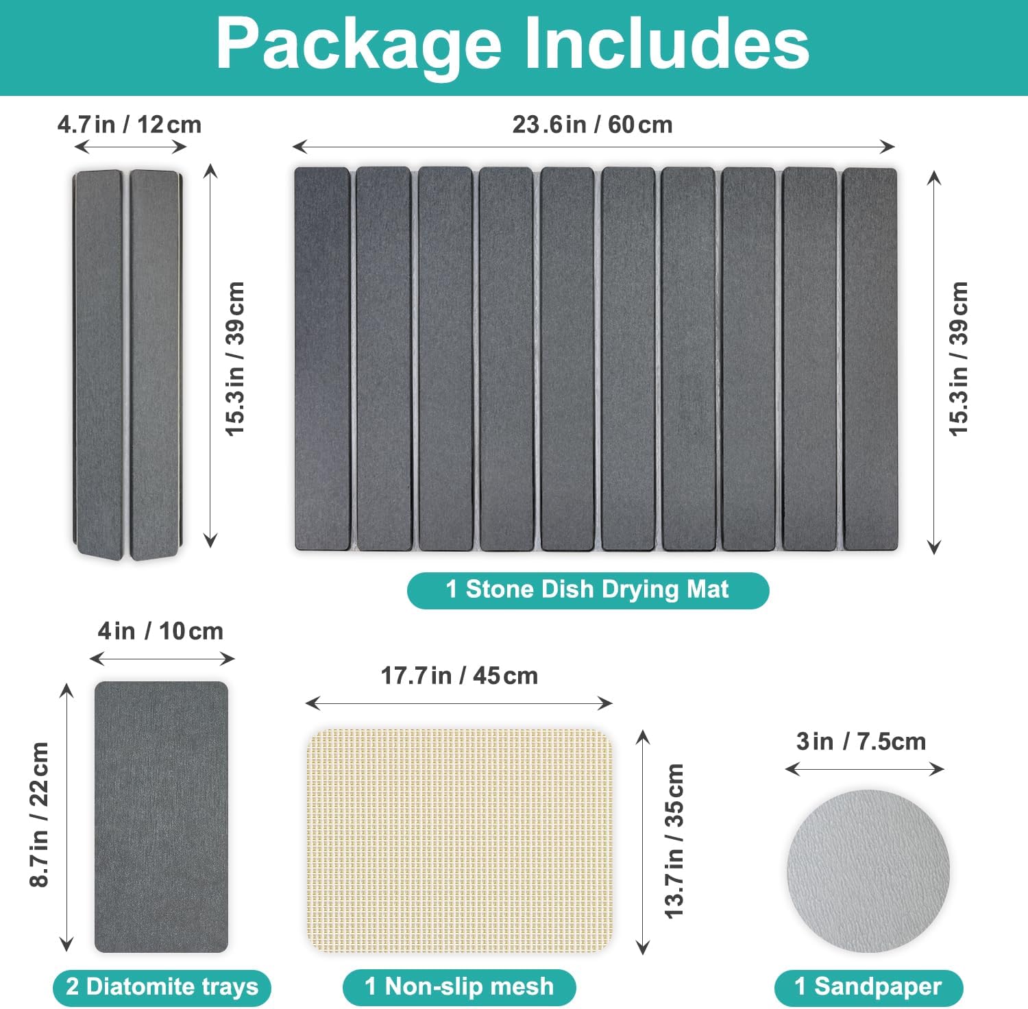 - 3 Pack Drying Stone Mats Set: You’ll receive one 23.6" x 15.3" large stone dish mat & 2 small stone drying trays, 1 sandpaper, and 1 non-slip pad.