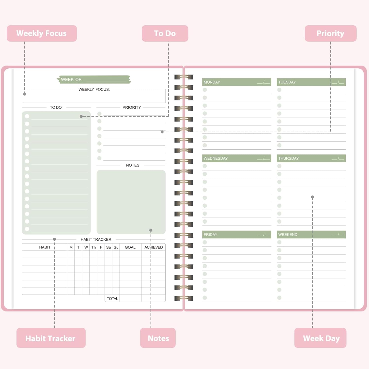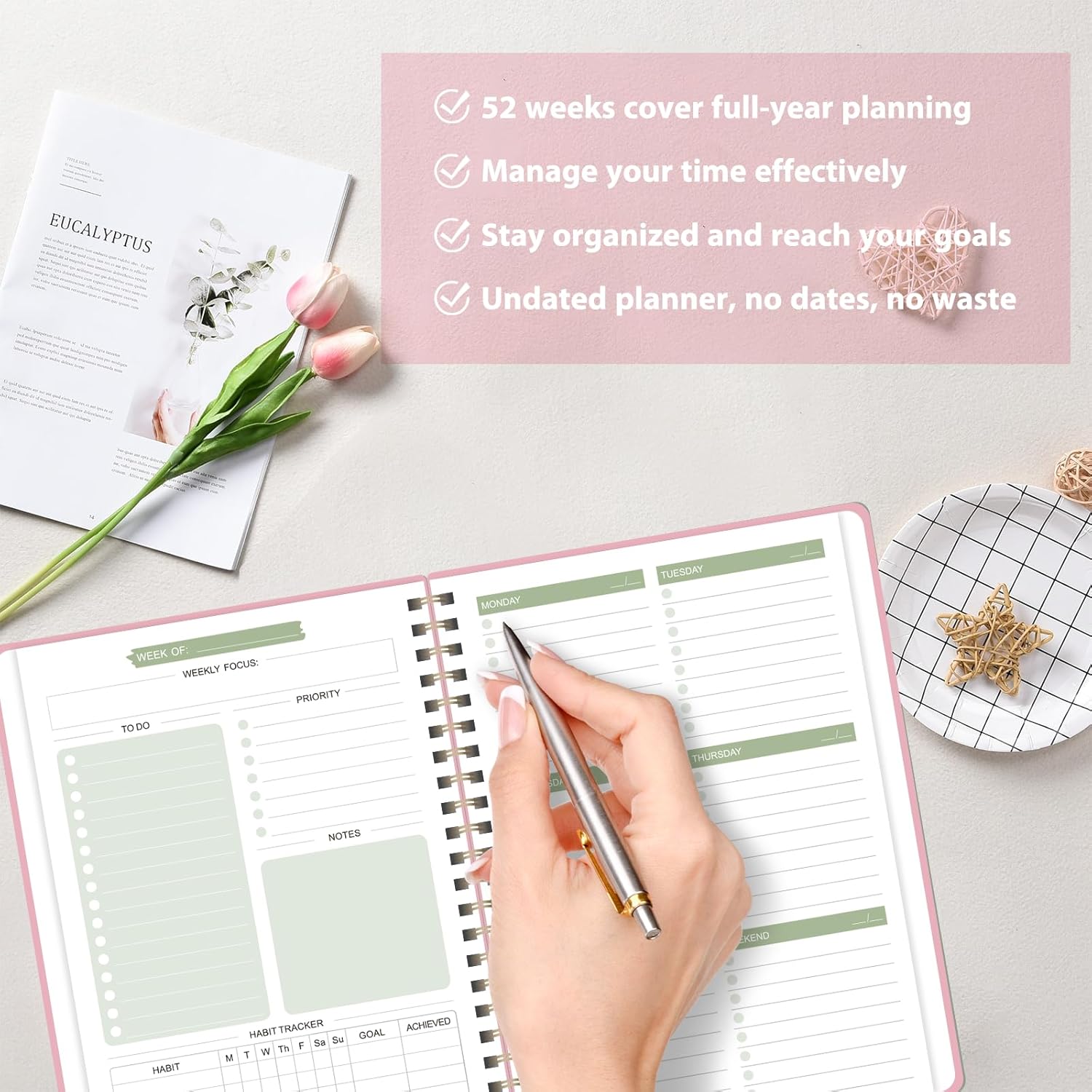 - [FLEXIBLE WEEKLY PLANNING] - Our undated weekly planner features 52 undated weeks, allowing you to start planning at any time without wasting pages. Whether it's 2025, 2026, or beyond, you can effortlessly continue your weekly planning journey without limitations.
