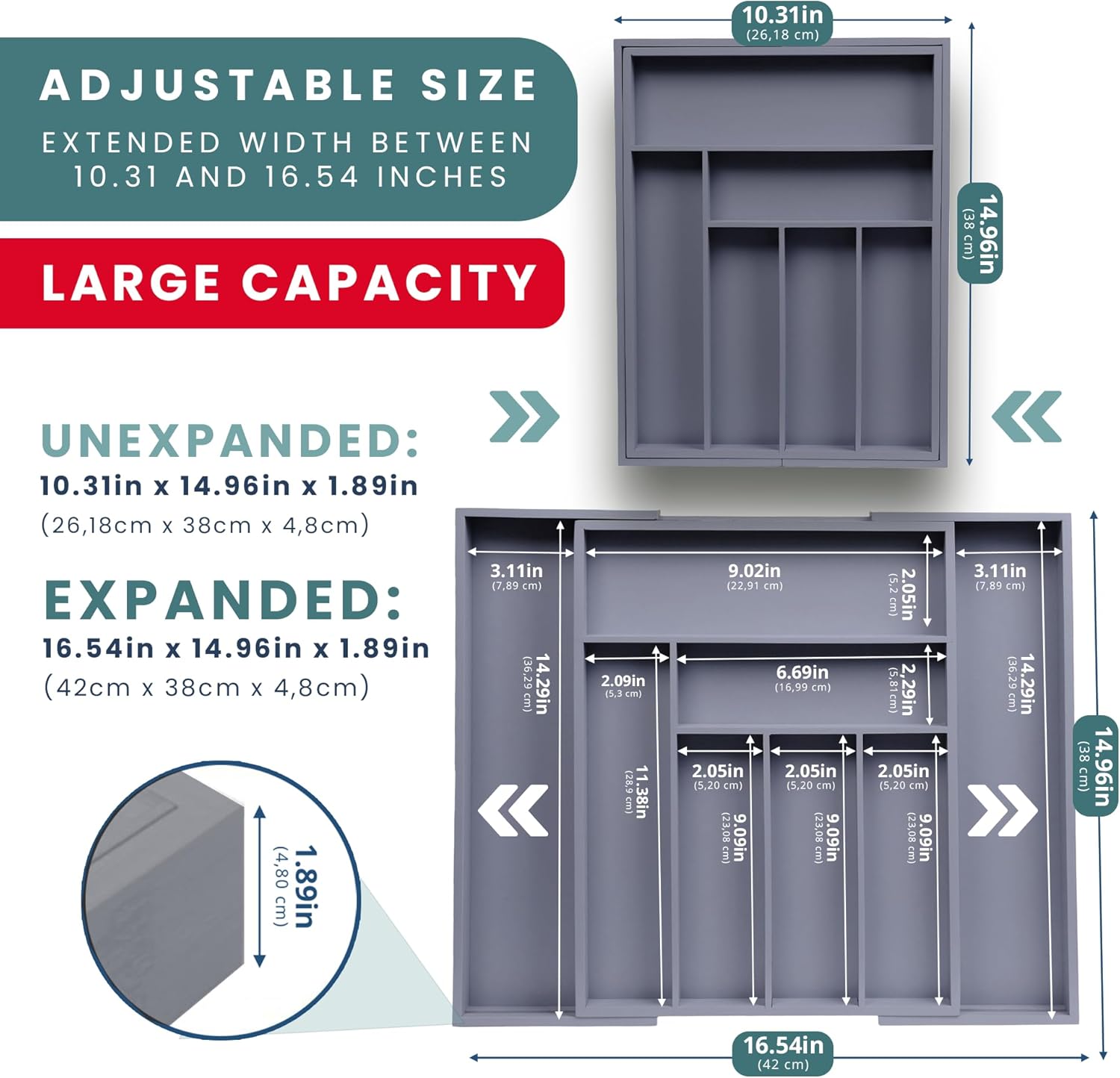 - Customizable Fit for Any Drawer Size: Easily expand this adjustable cutlery tray to perfectly fit a wide variety of drawer sizes in your kitchen, office, or bathroom. Whether your drawer is narrow or wide, the extendable design adapts from both sides to maximize space and provide a snug, tailored fit. Say goodbye to messy, cluttered drawers with this flexible storage solution that adjusts to your unique needs