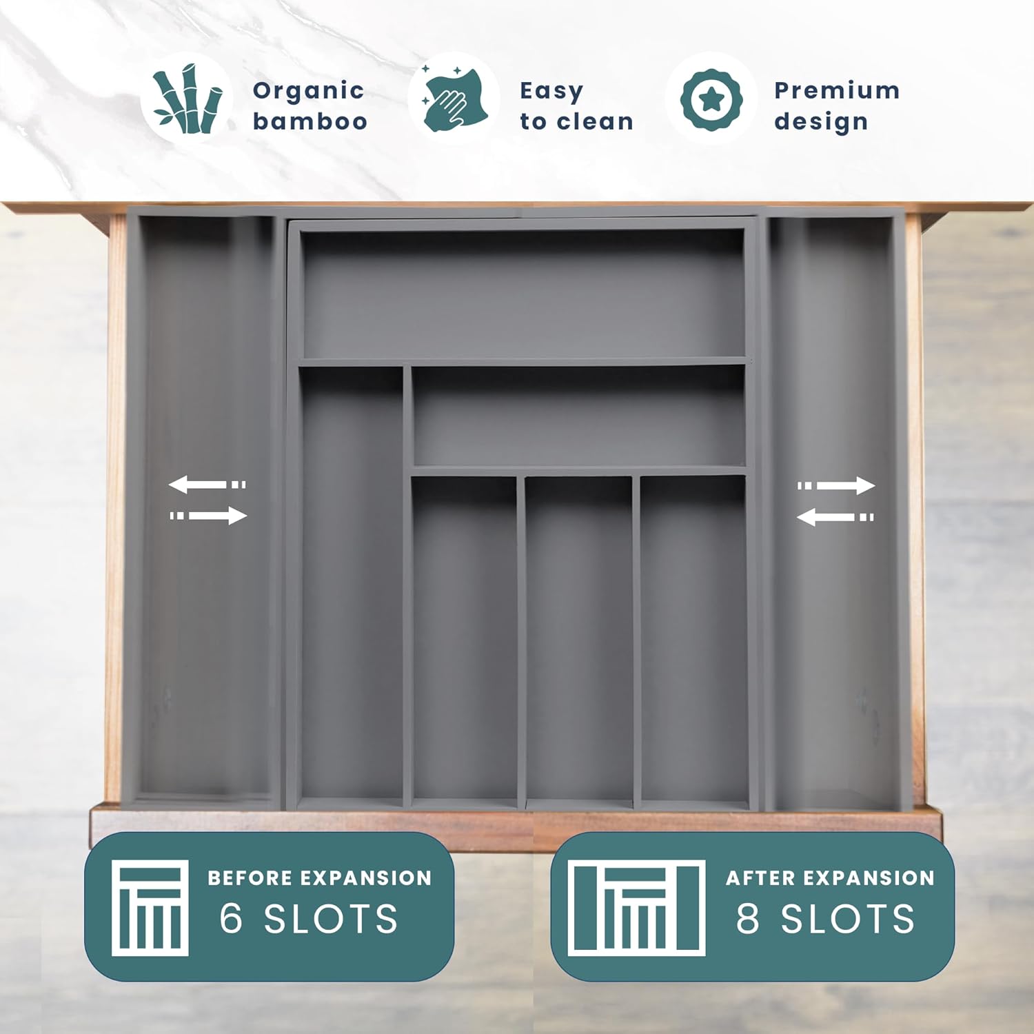 - Premium Wood Construction with Elegant Gray Finish: Crafted from high-quality, durable wood and finished in a sleek, modern gray, this drawer divider organizer adds a touch of elegance to your kitchen decor. Unlike flimsy plastic alternatives, it offers both beauty and strength, providing a long-lasting and environmentally friendly storage option you’ll be proud to show off