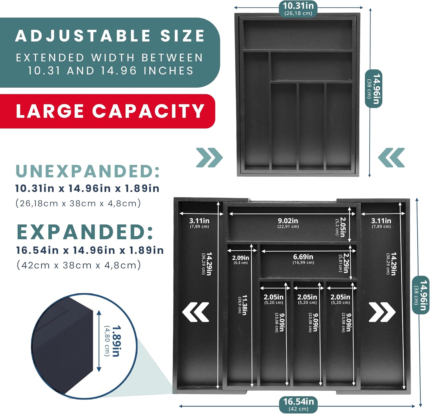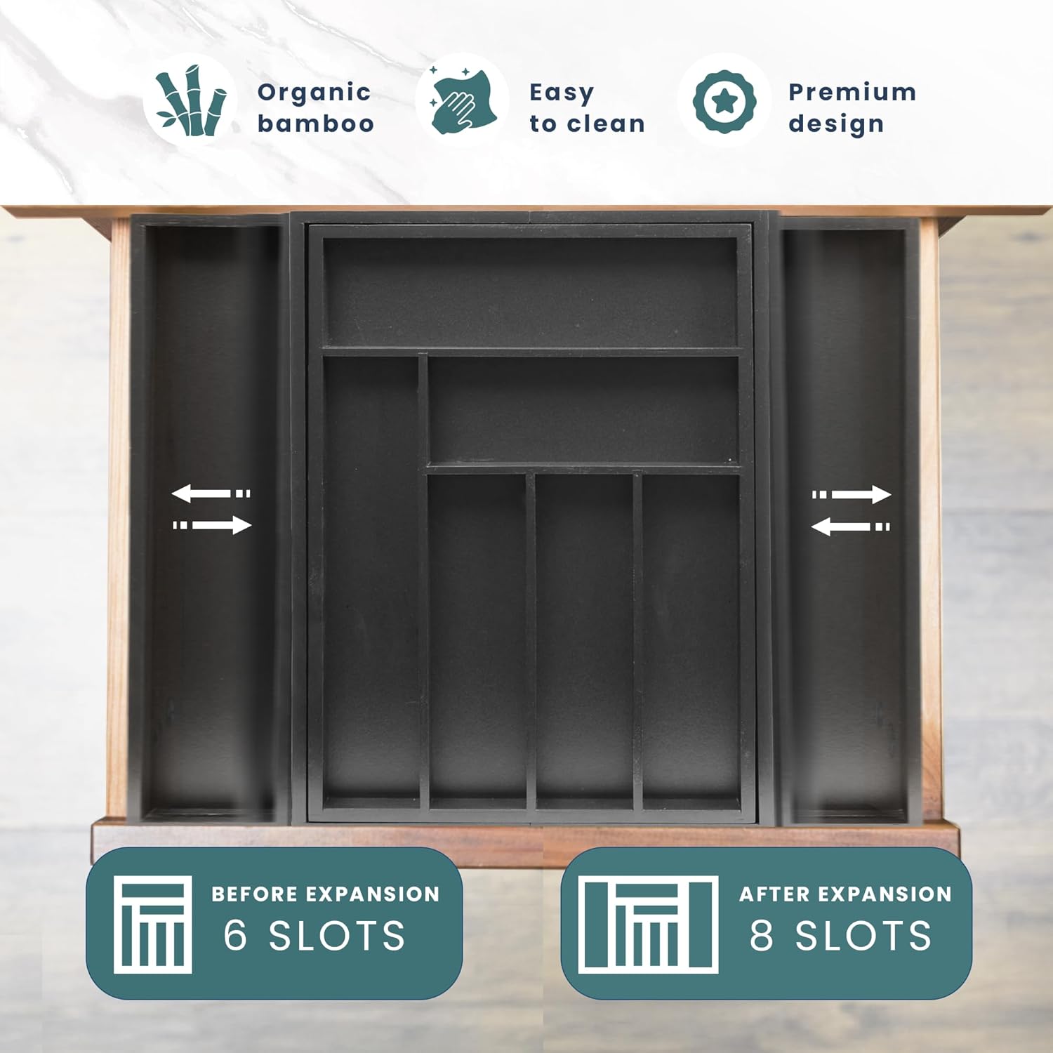 - Customizable Fit for Any Drawer Size: Easily expand this adjustable cutlery tray to perfectly fit a wide variety of drawer sizes in your kitchen, office, or bathroom. Whether your drawer is narrow or wide, the extendable design adapts from both sides to maximize space and provide a snug, tailored fit. Say goodbye to messy, cluttered drawers with this flexible storage solution that adjusts to your unique needs