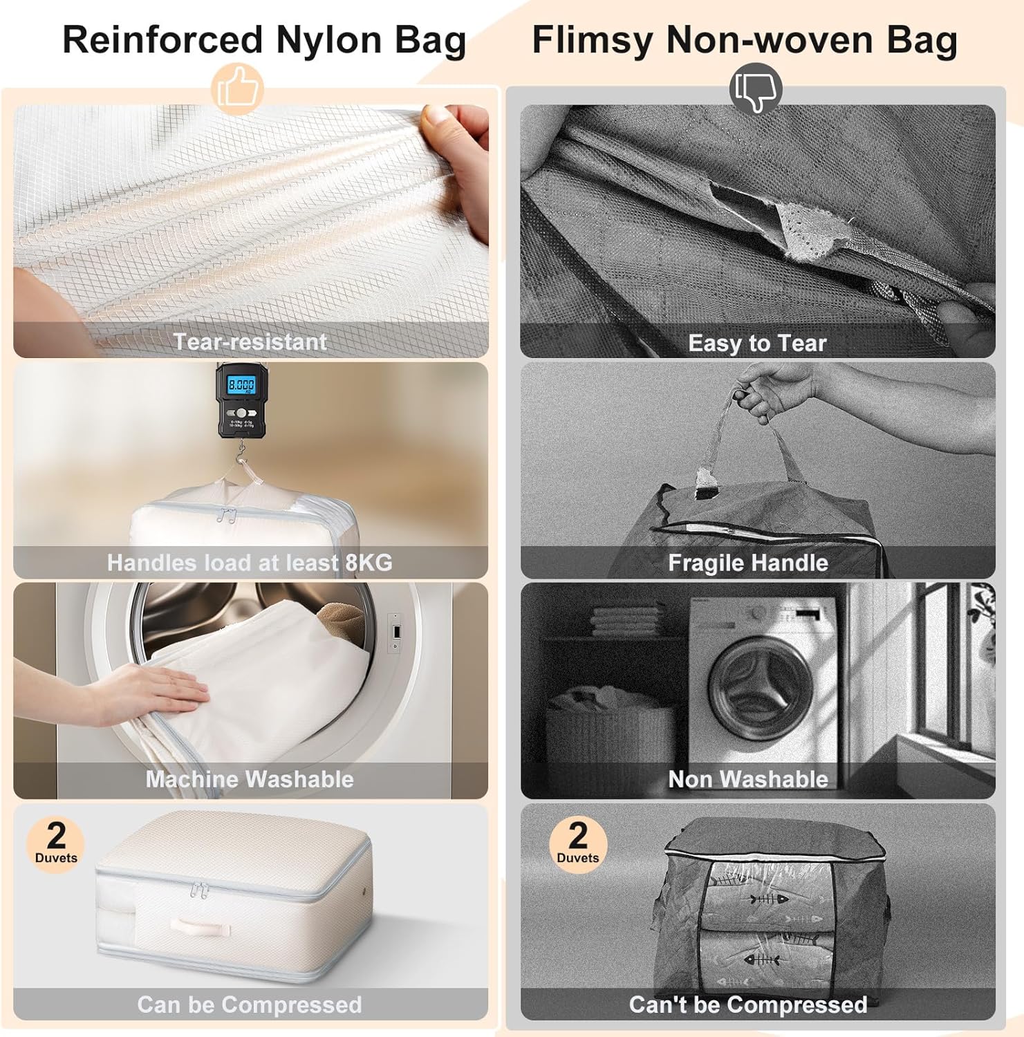 - [Washable & Tear-Resistant for Long-Lasting Use] Unlike non-woven bags and ordinary compression quilt bags, crafted from tear-resistant nylon fabric, our compression bags for storage are washable, odor-free, and slightly water-resistant. These features ensure that your bedding storage remains safe from dust, moisture, and wear, making it the ideal choice for protecting your household items long-term.