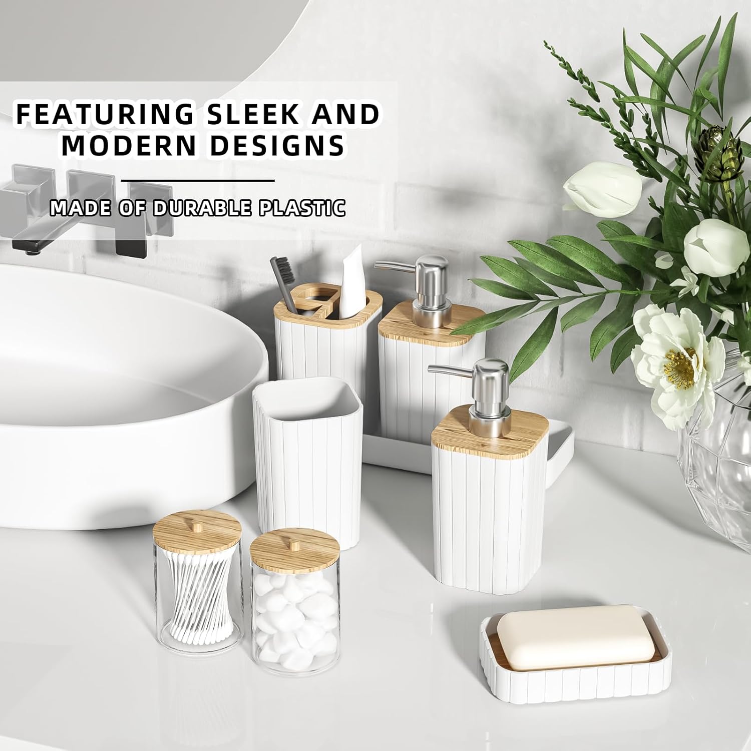 - DURABLE MATERIAL: Bathroom accessories set made out of premium plastic, think and sturdy. The pump head is coated stainless steel paint, prevent rust and corrosion. The various accessories inside satisfy your use of the bathroom set. Buy this bathroom accessories sets complete, you will not need to purchase additional products. Our set is fully covered.