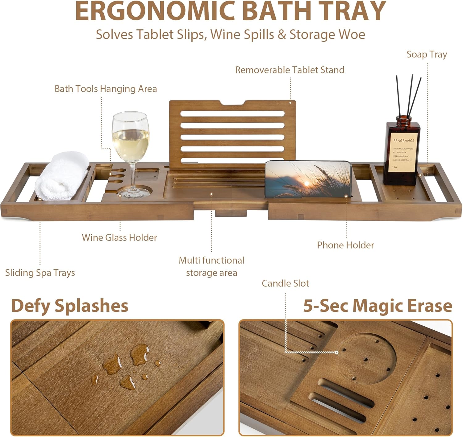 - All-in-One Bath Organizer with Removable Trays- Holds everything within arm’s reach, dedicated spots for wine glasses, candles, phones, books, plus two removable towel trays. No more balancing acts – just pure bath-time bliss