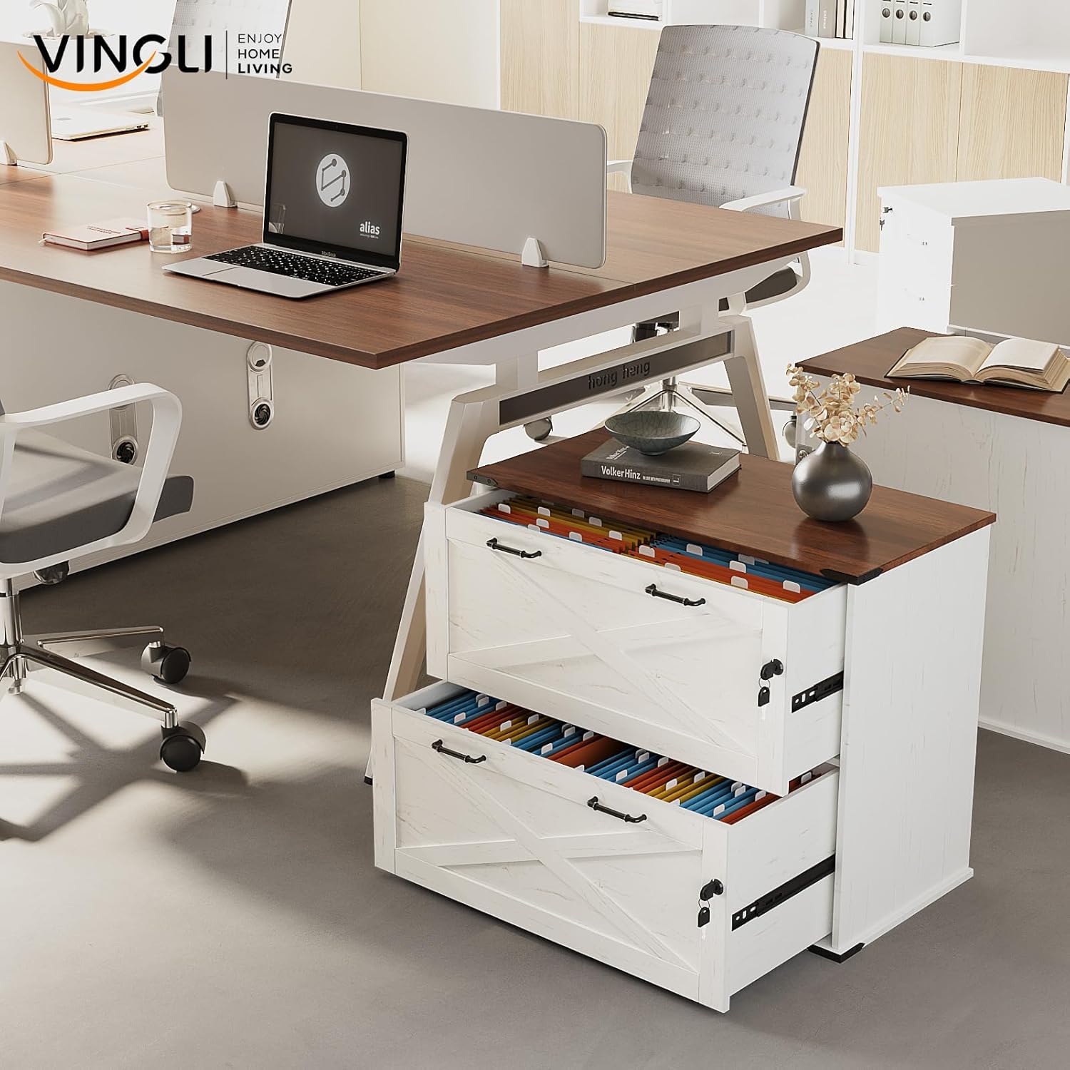 VINGLI 2 Drawer File Cabinet with Lock, Home Office Filing Organizer, for Letter Legal A4 Size File Folder Storage, Modern Farmhouse, Wood Lateral Filing Cabinet, Archivador (Rustic White & Brown)