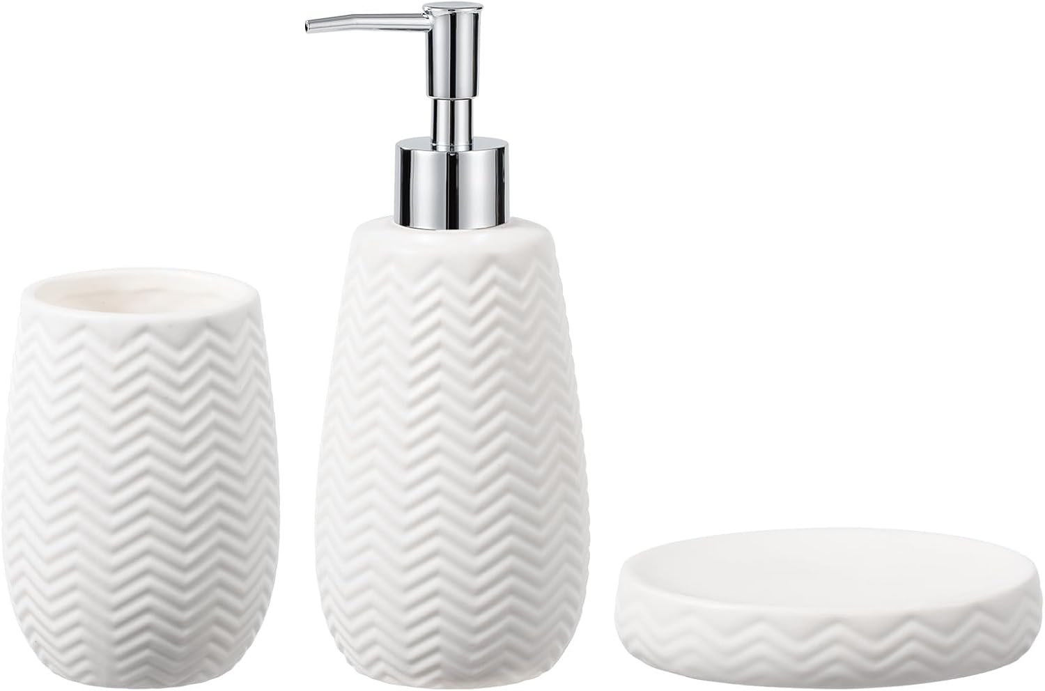White Bathroom Accessories Set, 3pcs Ceramic Wave Design Farmhouse Decor, Complete countertop Bathroom Decor with soap Dispenser,Toothbrush Holder and soap Dish for Stylish Bathroom Organization