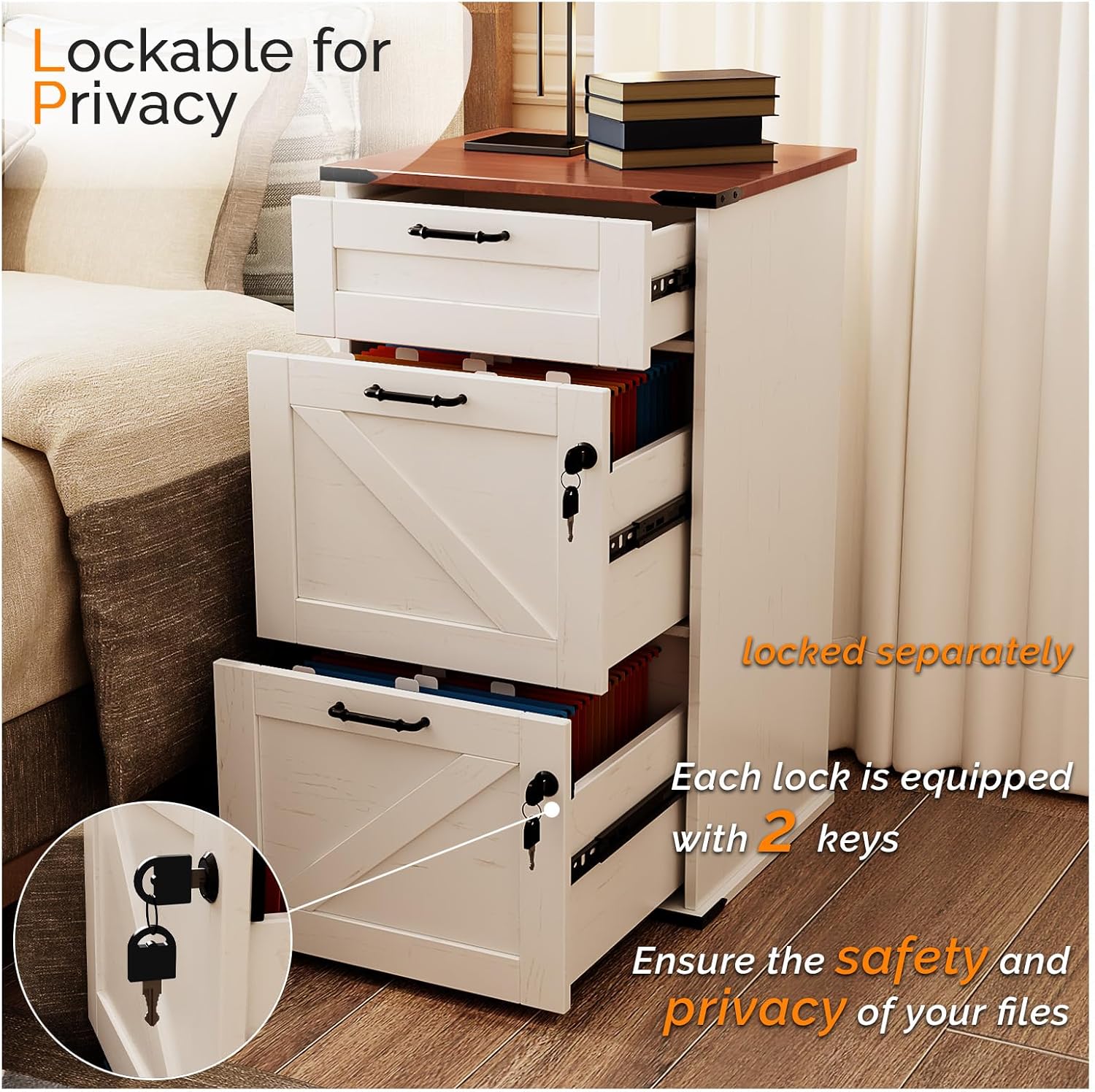 VINGLI 3 Drawer File Cabinet with Lock, Home Office Filing Organizer, for Letter Size File Folder Storage, Modern Farmhouse Style, Wood Vertical Filing Cabinet, Archivador (Rustic White & Brown)