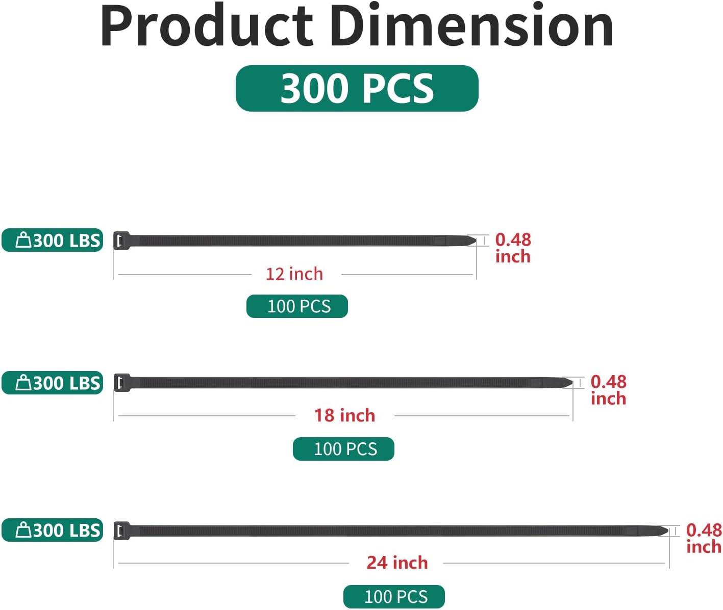 - 【Packages include】300 pcs cable ties (12 inch 100pcs , 18 inch 100pcs , 24 inch 100pcs , ). Different sizes of cable ties basically meet your daily or working needs.