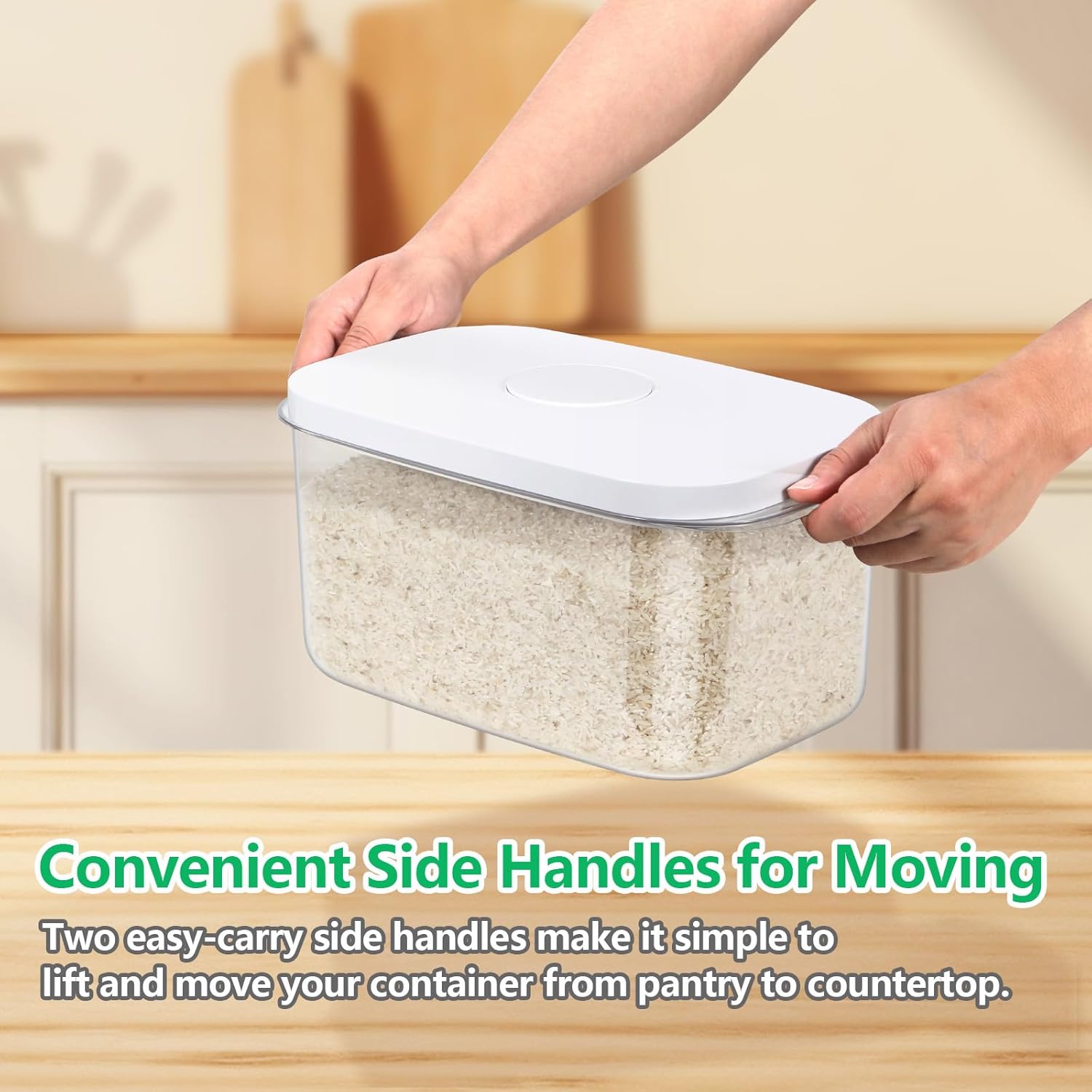 - VERSATILE RICE STORAGE CONTAINER: This rice container with airtight lid is great for storing bulk rice, flour, cereal, beans, oats, nuts, pet food and much more. Crystal clear container allow to see the food at a glance and remind you to refill. Plus, the sleek see-through design makes it look more visually appealing on your kitchen cabinet