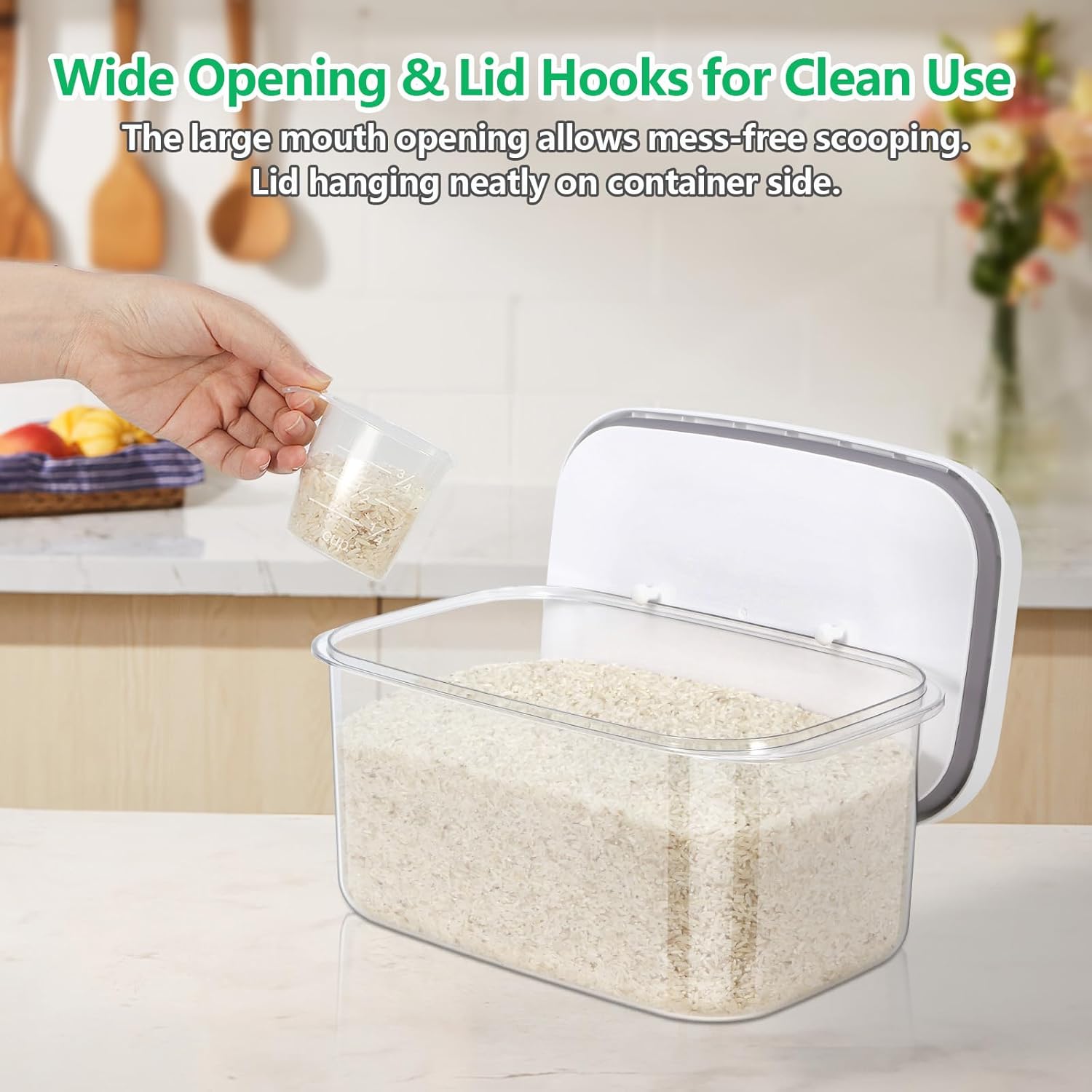 - USER- FRIENDLY RICE CONTAINER: Push-button on lid makes opening and seal easy, also serving as a handle to take the lid with one hand. The big mouth and the convenient measuring cup allow to grab ingredients easily