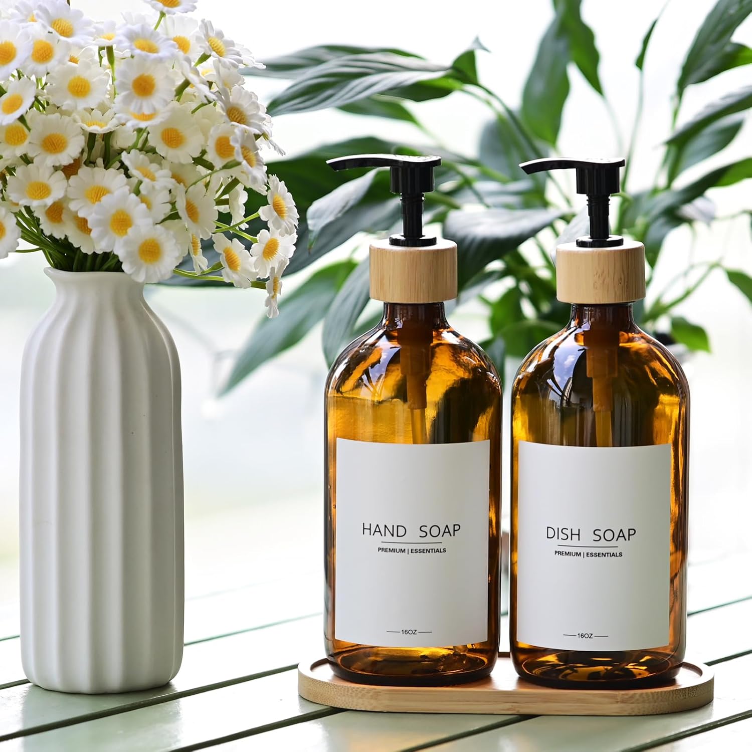 Luxury Glass Soap Dispenser Set - 2 Refillable 16.9oz Bottles, Bamboo Pump & Tray for Farmhouse & Modern Decor, 9 Waterproof Labels for Kitchen/Bathroom (Amber Bottle+Black Bamboo Pumps+Tray)