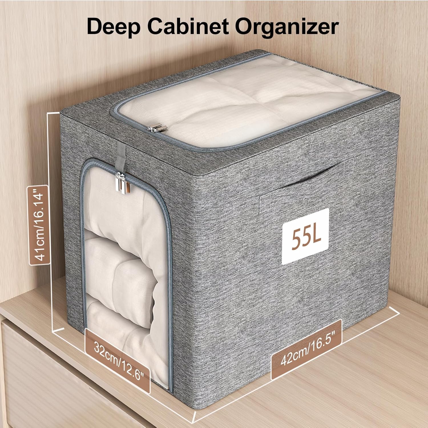 GoMaihe Clothes Storage Bins Metal Frame: 55L Extra Large Stackable Closet Storage Bin with Lid & Clear Window, Heavy Duty Blanket Box for Winter Coats Comforters (Fits Deep Closet 6-Pack)