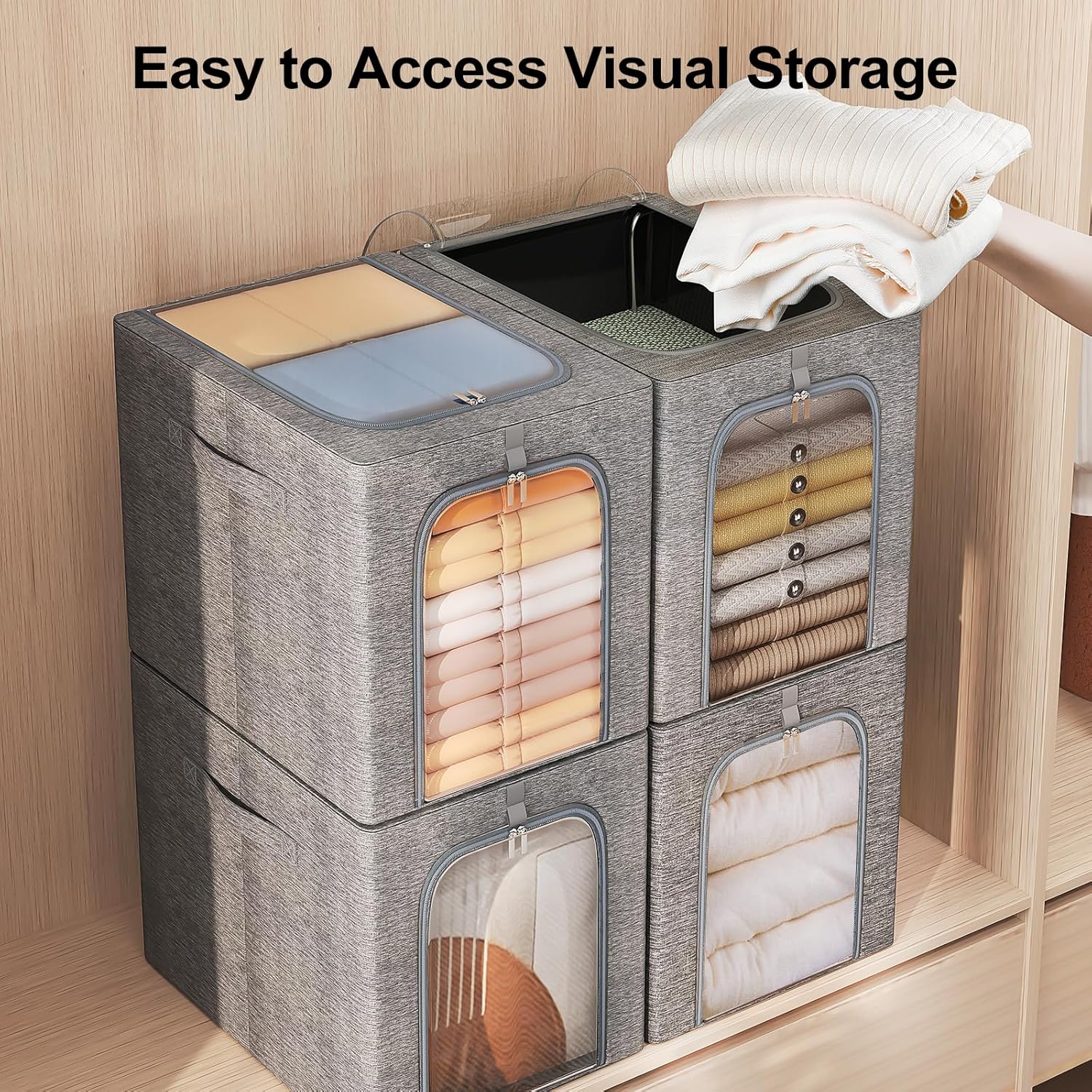 GoMaihe Clothes Storage Bins Metal Frame: 55L Extra Large Stackable Closet Storage Bin with Lid & Clear Window, Heavy Duty Blanket Box for Winter Coats Comforters (Fits Deep Closet 4-Pack)