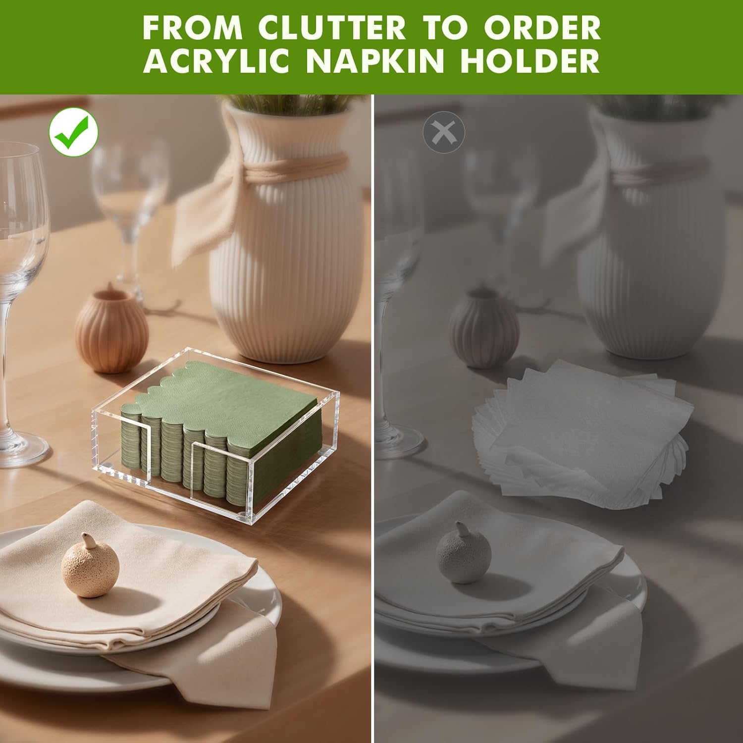 - ☘️【EXCELLENT QUALITY】The napkins holders is made of high quality acrylic for a sturdy construction and great durability. Product size: 5.9*5.9*2inn. Product thickness: 4mm, bottom thickness: 5mm.