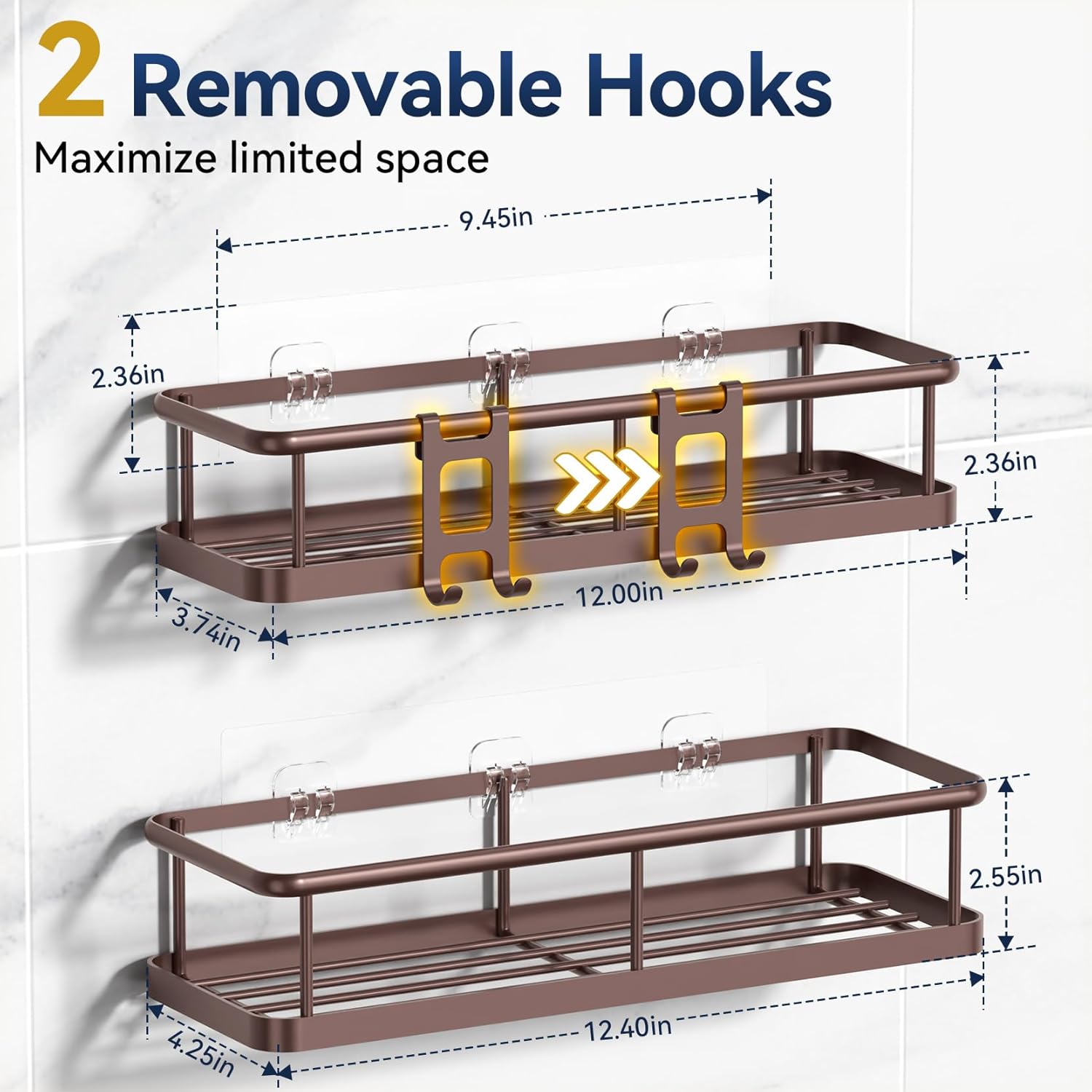 - 【2 Shower Organizer Racks for Inside Shower】With 2 shower caddies (Different sizes), 4 removable hooks, and 2 adhesives, the large capacity of this bathroom organizer easily holds toiletries or cooking seasonings, making your life easier. Maximize the use of minimal space to organize your bathroom, kitchen, RV, bedroom, living room, laundry room, etc