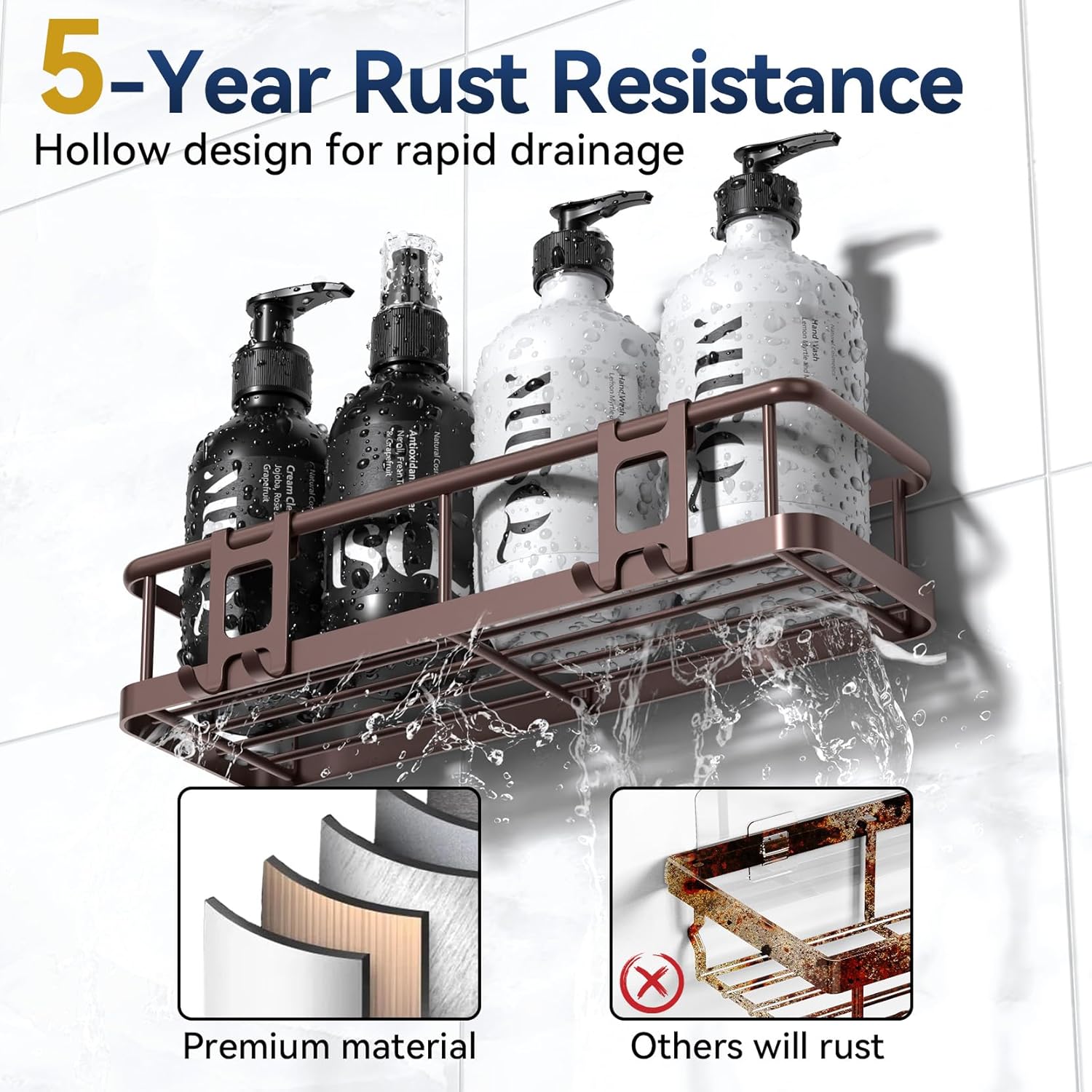 - 【Durable Metal, Hollow Drain Design】The bathroom shower racks are made of high quality metal, high temperature paint process, durable; Passed the 48-hour salt spray test, rust resistant, waterproof, scratch resistant, can accompany you for up to 5 years. Hollow design at the bottom, good ventilation and drainage, convenient cleaning. Keep shelves and bathroom necessities dry