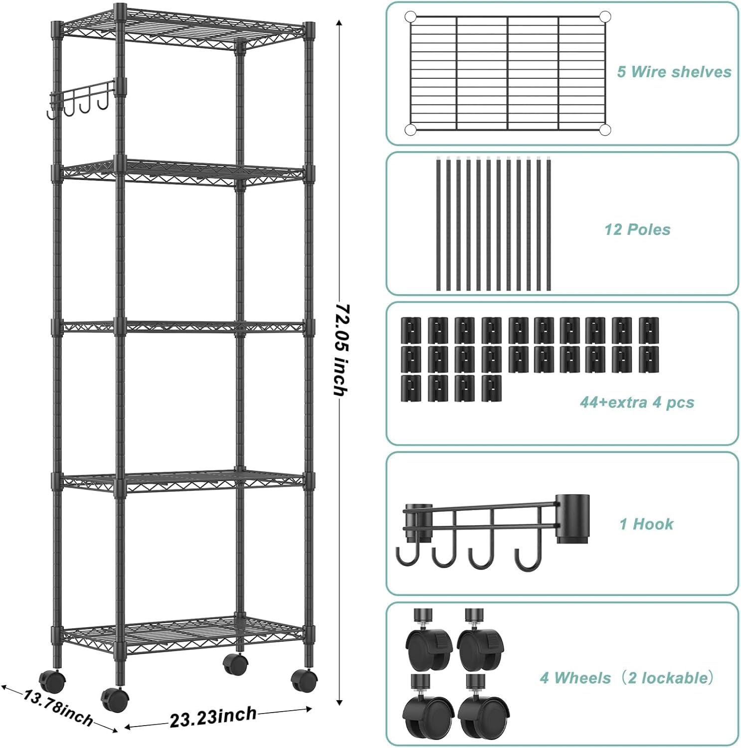 Himimi 5-Tier Wire Shelving Unit on Wheels, Adjustable Heavy Duty Metal Shelves with Side Hooks, Metal Organization Wire Rack for Kitchen Garage Basement, 13" L x 23" W x 72" H, Black