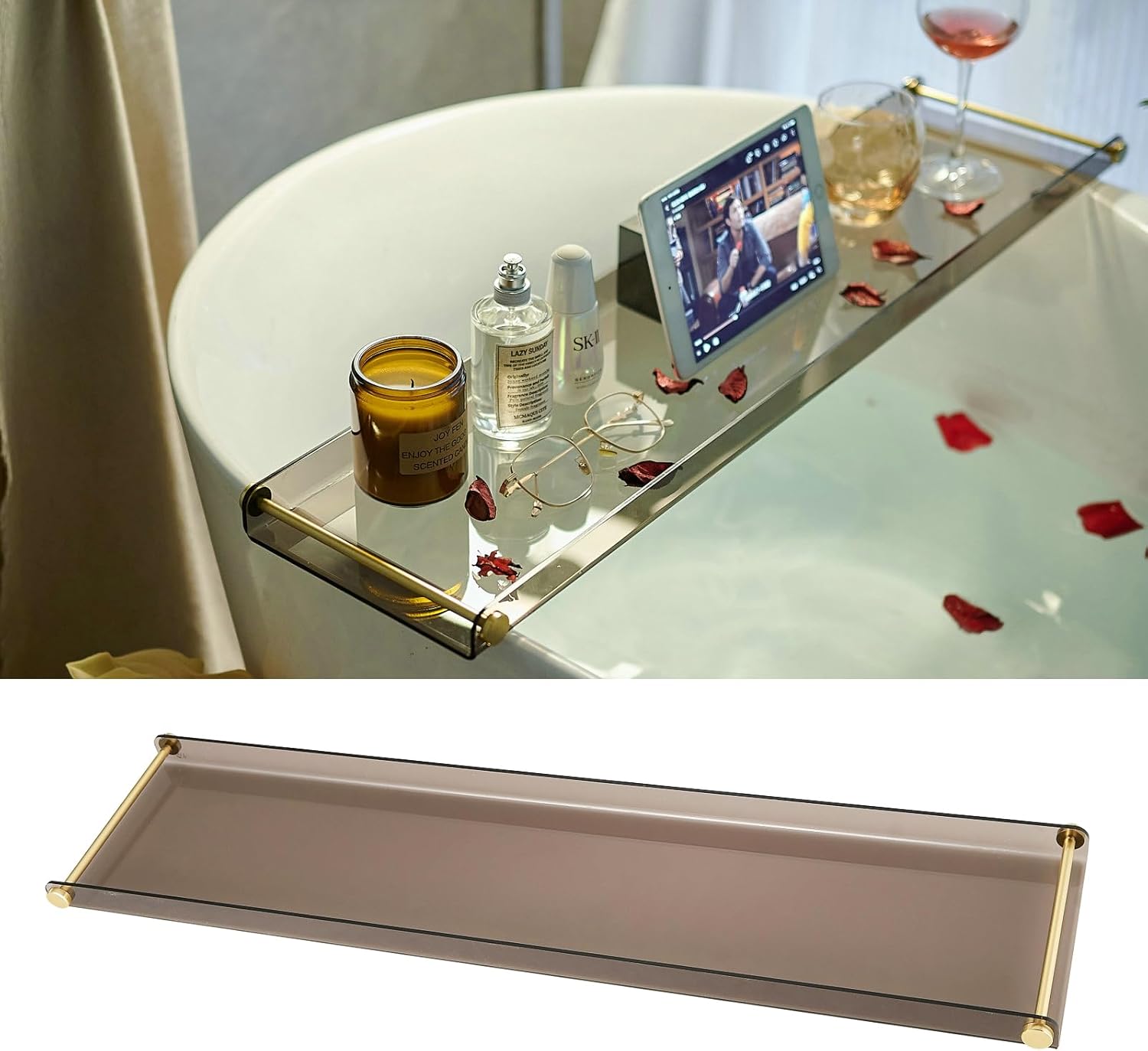 Acrylic Bathtub Tray Caddy, Clear Bath Shelf Tub Rack with Golden Handle, Luxury Bathroom Organizer Tablet Holder (Transparent Black) SHUNLI
