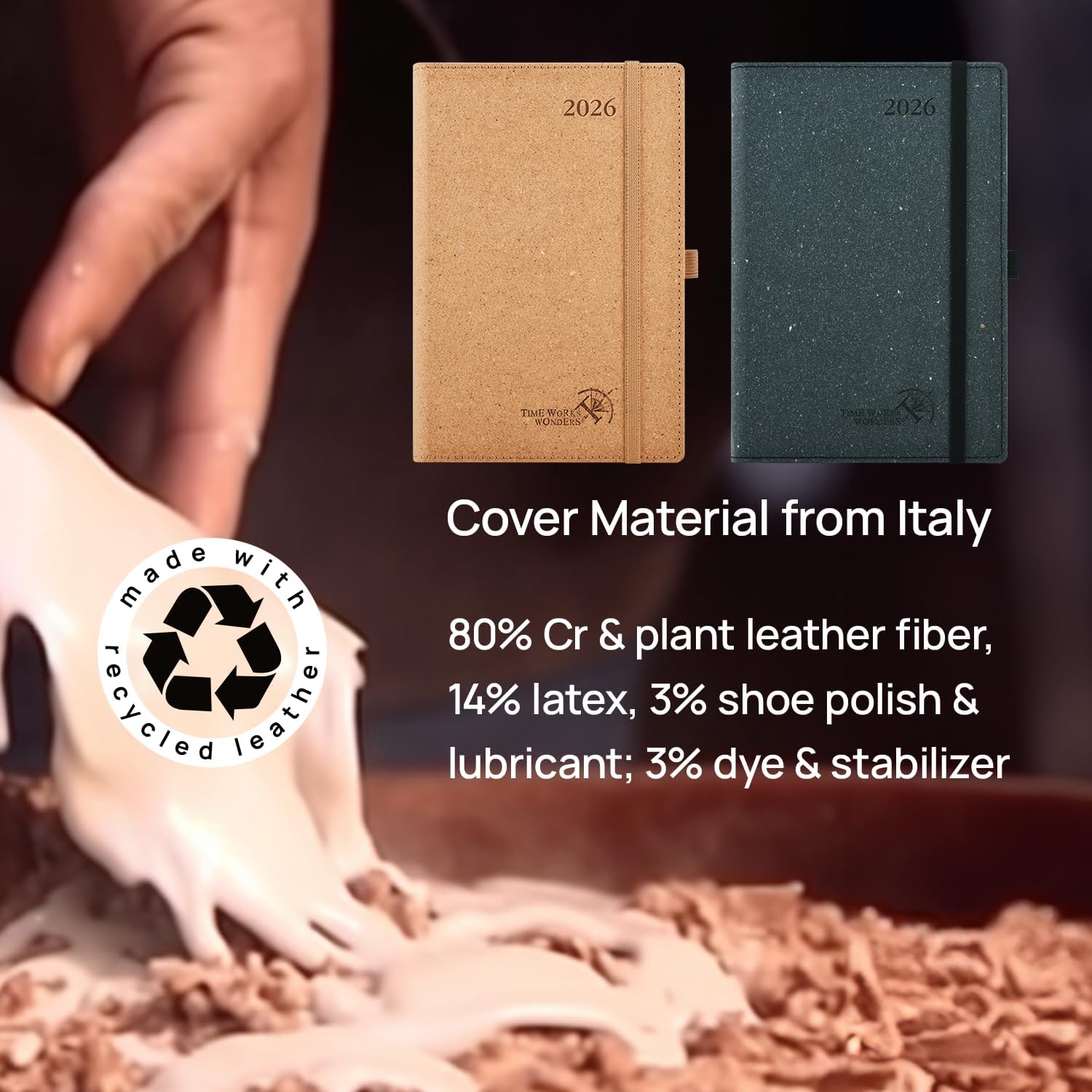 POPRUN 2026 Recycled Daily Planner 12 Months (A5 Medium Size 5.75'' x 8.6'') - One Page Per Day Calendar Hourly Appointment Book with Italian Regenrated Leather, Monthly Tabs, Pocket - Black Grey