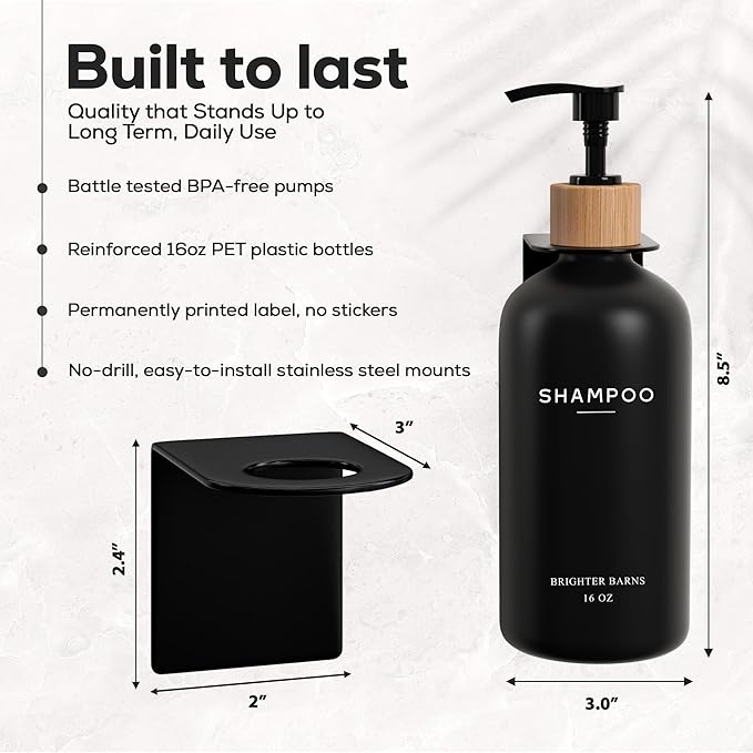 - AMERICAN DESIGN, UNCOMPROMISING QUALITY - Crafted with meticulous attention to detail, our aesthetic shampoo dispenser for shower wall features a Set of 3 ultra-durable, sturdy and shatterproof 16oz PET plastic shower bottles, rustproof BPA-free bamboo pumps, and 3 drill-free stainless steel wall mounts. All designed in the USA to provide unbeatable quality and enduring style that you can trust.