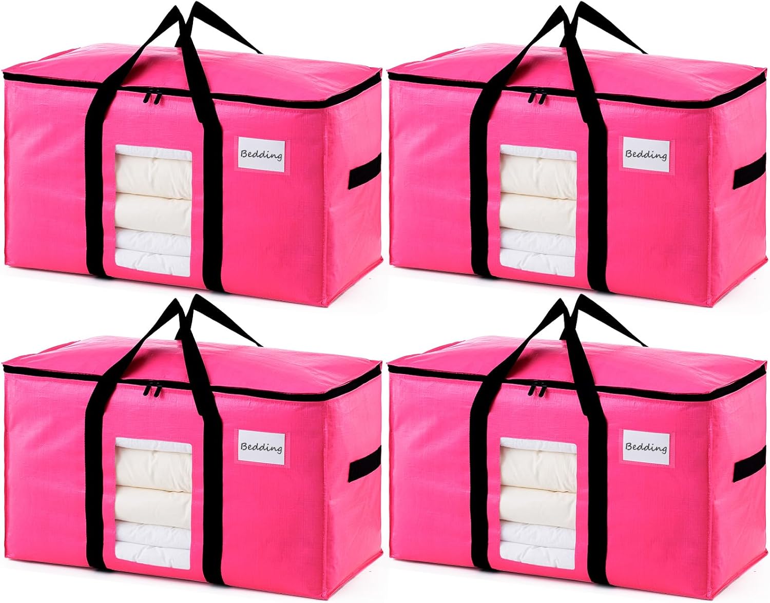 TAILI 4 Pack Pink Extra Large Moving Bags, Heavy Duty Totes with Visible Window, Wrap Around Handles, Great for Storage, Space-Saving